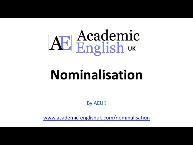 Nominalisation is the process of changing verbs & adjectives into nouns. This is a typical feature of academic writing as it makes writing more concise and creates noun-phrase grammatical structures. This video takes your through the basics of nominalisation with an example nominalisation and then some exercises to practice this procedure. Video worksheet: http://academic-englishuk.com/wp-content/uploads/2022/03/Nominalisation-Video-Worksheet-by-Academic-English-UK.docx Oxford dictionary: https://www.oxfordlearnersdictionaries.com/ BUT IT NOW: Nominalisation worksheet: https://academic-englishuk.com/downloads/nominalisation/ Nominlaistion webpage: https://www.academic-englishuk.com/nominalisation