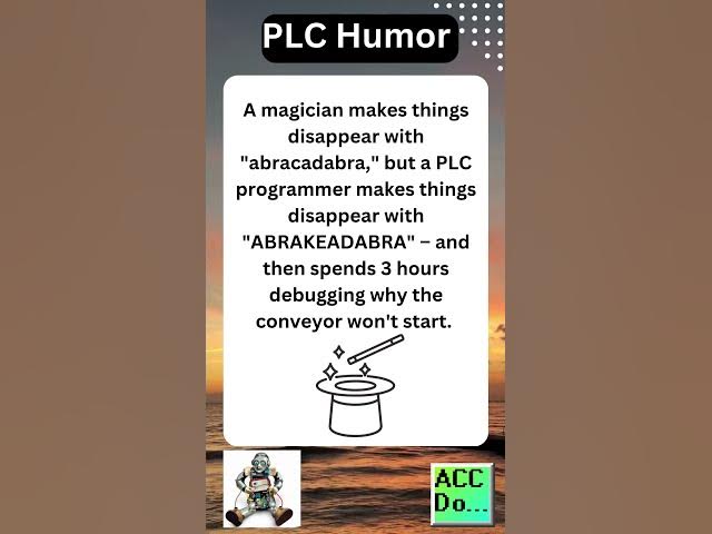PLC Humor Playlist: https://www.youtube.com/playlist?list=PL3y71jAPOdZC4DR-0DBBnNBwkwGV4tuQL Incorporating humor can be beneficial when developing PLC code. If you find yourself stuck on a problem, taking a break and clearing your mind can help. Some people go for a walk or step away from the situation. In these moments, injecting some PLC humor can lighten the mood and improve your mindset. PLC Beginner’s Guide to PLC Programming https://accautomation.ca/programming/plc-beginners-guide/ Learn or discover new possibilities with this comprehensive guide to programmable logic controllers. Need some direct PLC and HMI answers? Search Threads can help! This is a custom Google Search for answers from the top automation and control forums. Give it a try… https://accautomation.ca/search_gcse/ PLC Laws Playlist https://www.youtube.com/playlist?list=PL3y71jAPOdZDCQhpRcy4FpDCQ0Np1GZxb PLC Laws are from a thread started at Mr. PLC in 2006. The intention was to pass along knowledge to up-and-coming programmers. Drawing from PLC gurus' personal histories, these light-hearted PLC laws are educational and entertaining. It's great to be able to laugh with PLC humor. Regards, Garry ACC Automation