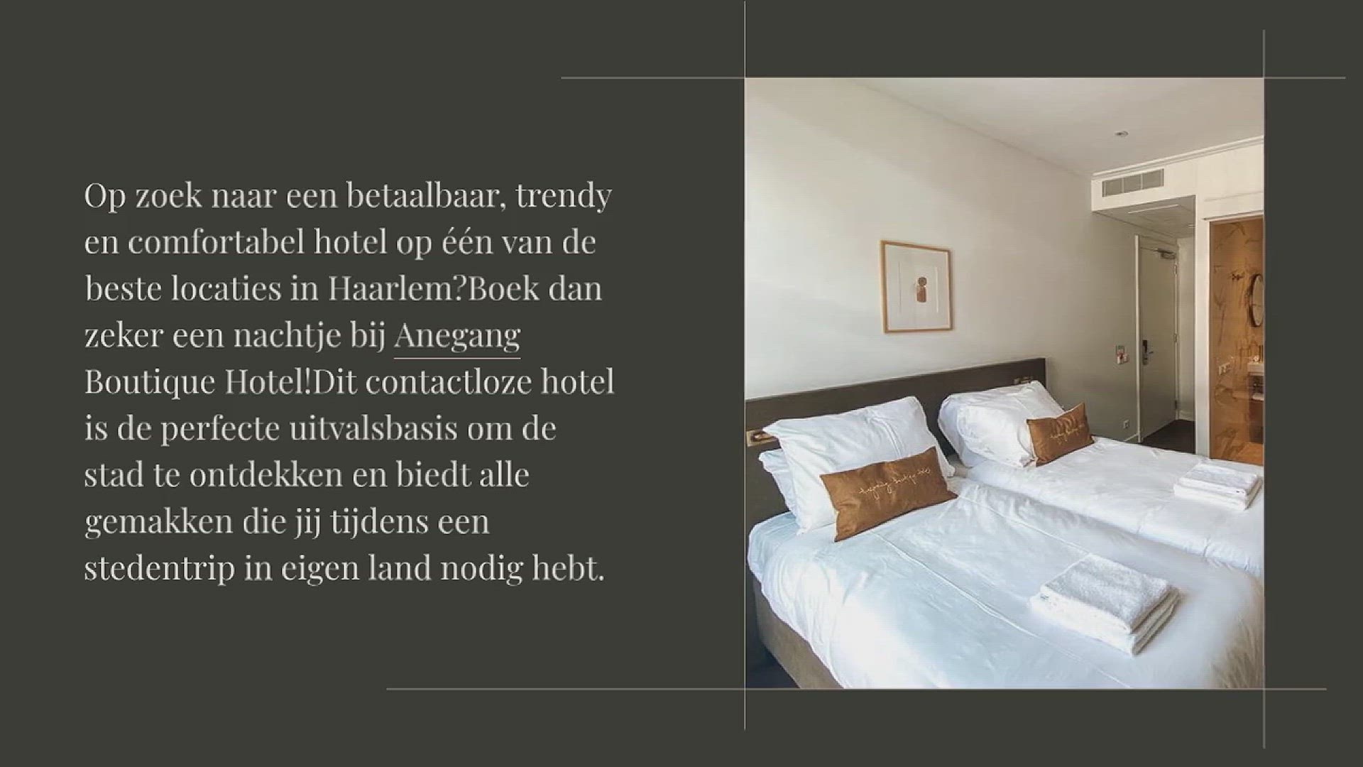 Op zoek naar een betaalbaar, trendy en comfortabel hotel op één van de beste locaties in Haarlem? Boek dan zeker een nachtje bij Anegang Boutique Hotel! Dit contactloze hotel is de perfecte uitvalsbasis om de stad te ontdekken en biedt alle gemakken die jij tijdens een stedentrip in eigen land nodig hebt.