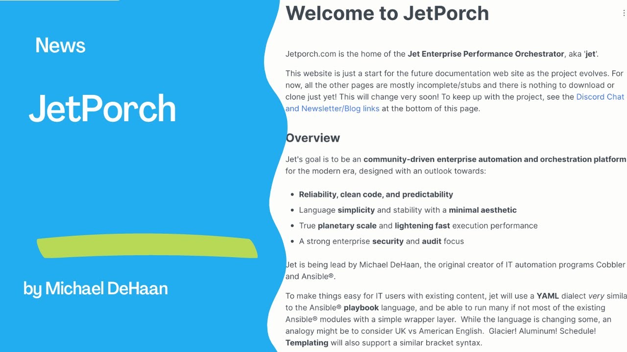 Overview of the JetPorch project led by Michael DeHaan: Rust-automation like Ansible.