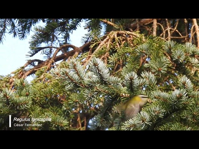 El reyezuelo listado (Regulus ignicapilla) es una pequeña ave que vive en una amplia variedad de bosques frescos y húmedos de la mitad norte peninsular, mientras que aparece de forma más localizada en la mitad sur, donde se recluye en los bosques de los principales macizos montañosos. Su dieta se basa en pequeños invertebrados, generalmente pulgones, arañas y colémbolos. Vídeo realizado por César Fernández en Vidiago (Asturias).
