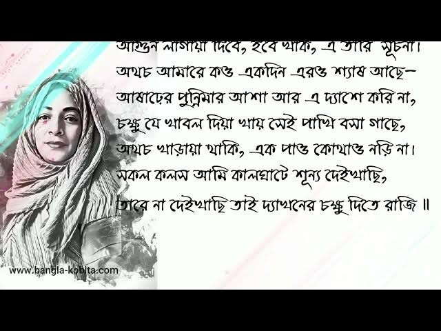 কবিতা - পরানের গহীন ভিতর ১০ কবি - সৈয়দ শামসুল হক আবৃত্তি - সেলিনা জাহান Kobita - Poraner Gohin Bhitor 10 Kobi - Syed Shamsul Haque Abritti - Selina Jahan Copyright - www.bangla-kobita.com কে য্যান কানতে আছে- তার শব্দ পাওয়া যায় কানে, নদীও শুকায়া যায়, আকালের বাতাস ফোঁপায়, মানুষেরা বাড়িঘর বানায় না আর এই খানে, গোক্ষুর লতায়া ওঠে যুবতীর চুলের খোঁপায়। বুকের ভিতর থিকা লাফ দিয়া ওঠে যে চিকুর, আমি তার সাথে দেই শিমুলের ফুলের তুলনা, নিথর দুফর বেলা, মরা পাখি, রবি কি নিষ্ঠুর, আগুন লাগায়া দিবে, হবে খাক, তারি এ সূচনা। অথচ আমারে কও একদিন এরও শ্যাষ আছে- আষাঢ়ের পুন্নিমার আশা আর এ দ্যাশে করি না, চক্ষু যে খাবল দিয়া খায় সেই পাখি বসা গাছে, অথচ খাড়ায়া থাকি, এক পাও কোথাও নড়ি না। সকল কলস আমি কালঘাটে শূন্য দেইখাছি, তারে না দেইখাছি তাই দ্যাখনের চক্ষু দিতে রাজি ॥