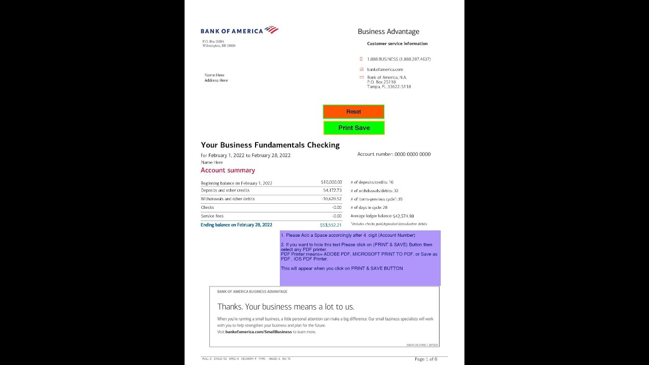 #Bank_Statement_Template #Bank_of_America_Bank_Statement Links: https://banktemplate.net/boa-february-2022-bank-statement-template More Products: January 2022 Bank Statement Template: https://banktemplate.net/boa-january-2022-editable-bank-statement It's the beginning of March 2022 and we know that you going to need a Bank of America February 2022 Bank Statement. We thank all the customers who have given their valuable feedback. Based on your feedback, we have been able to further improve our bank statement Templates. Here's the newly updated and customizable Bank Statement Bank of America February 2022 Bank Statement Template About This Product: With this Bank Statement Template Software you can easily generate a February 2022 Bank statement within 5 minutes. 100% accurate font for BOA statements is given with this product. Auto Calculations