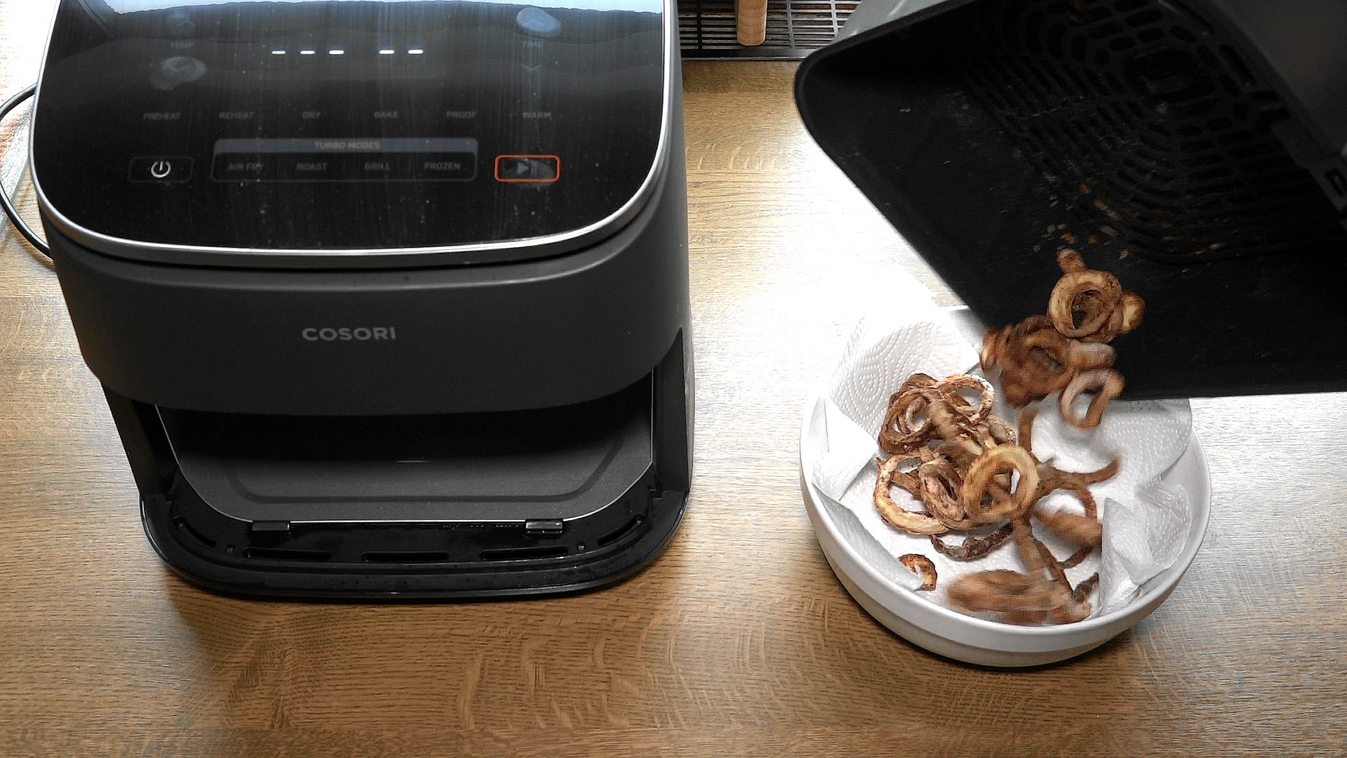 Die Zwiebelringe erst in ein Sieb und dann in den Schacht des Airfryer geben