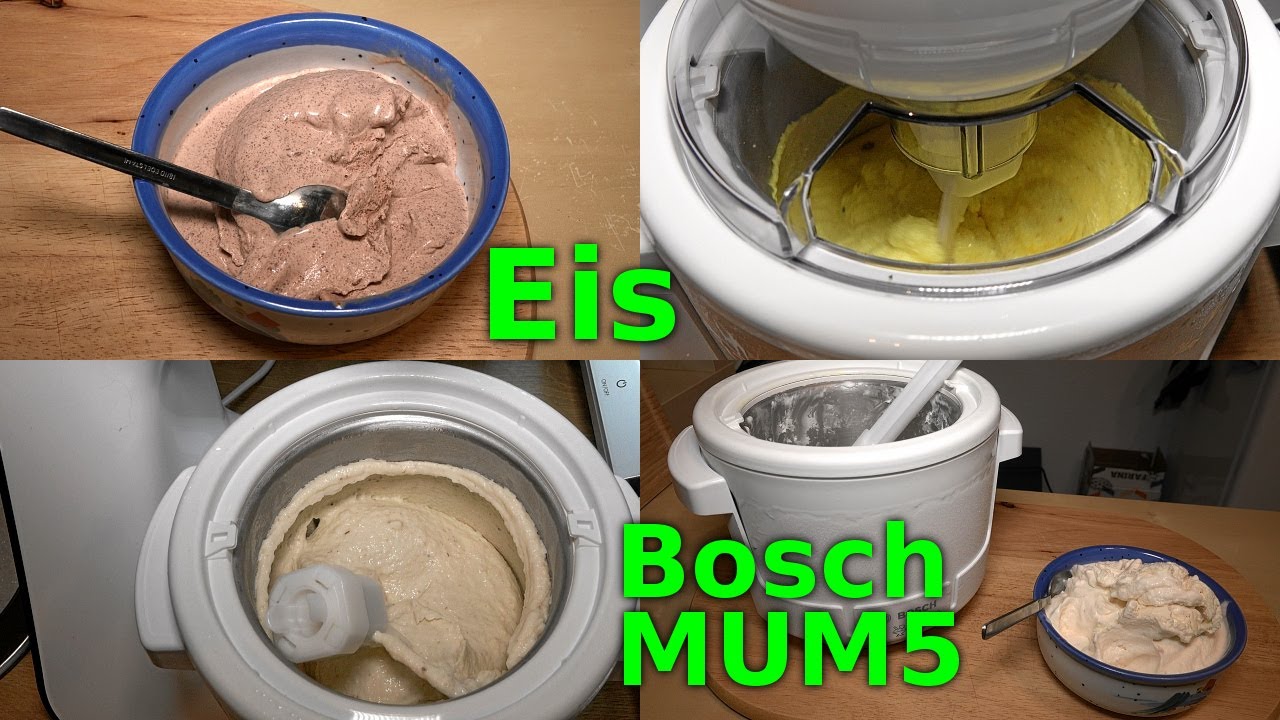 In diesem Video zeige ich euch die Zubereitung von 4 Sorten Eis mit dem Eisbereiter MUZ5EB2 für die Bosch MUM5.