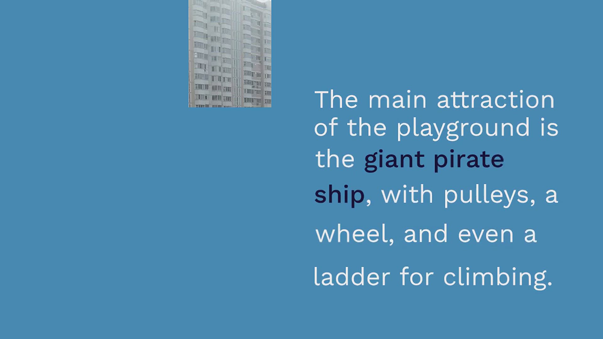 The main attraction of the playground is the giant pirate ship, with pulleys, a wheel, and even a ladder for climbing.