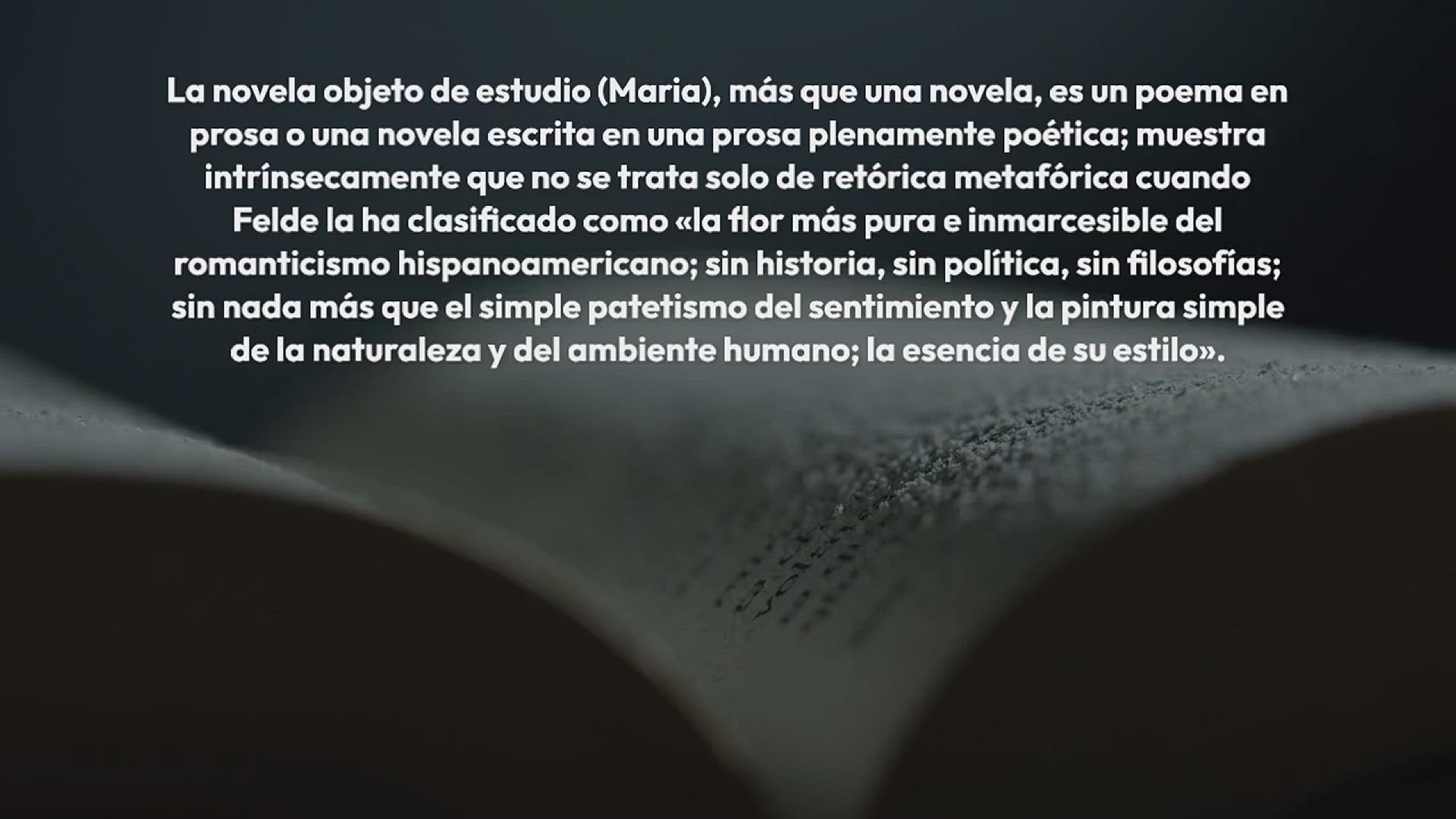 La novela objeto de estudio (Maria), más que una novela, es un poema en prosa o una novela escrita en una prosa plenamente poética; muestra intrínsecamente que no se trata solo de retórica metafórica cuando Felde la ha clasificado como «la flor más pura e inmarcesible del romanticismo hispanoamericano; sin historia, sin política, sin filosofías; sin nada más que el simple patetismo del sentimiento y la pintura simple de la naturaleza y del ambiente humano; la esencia de su estilo».