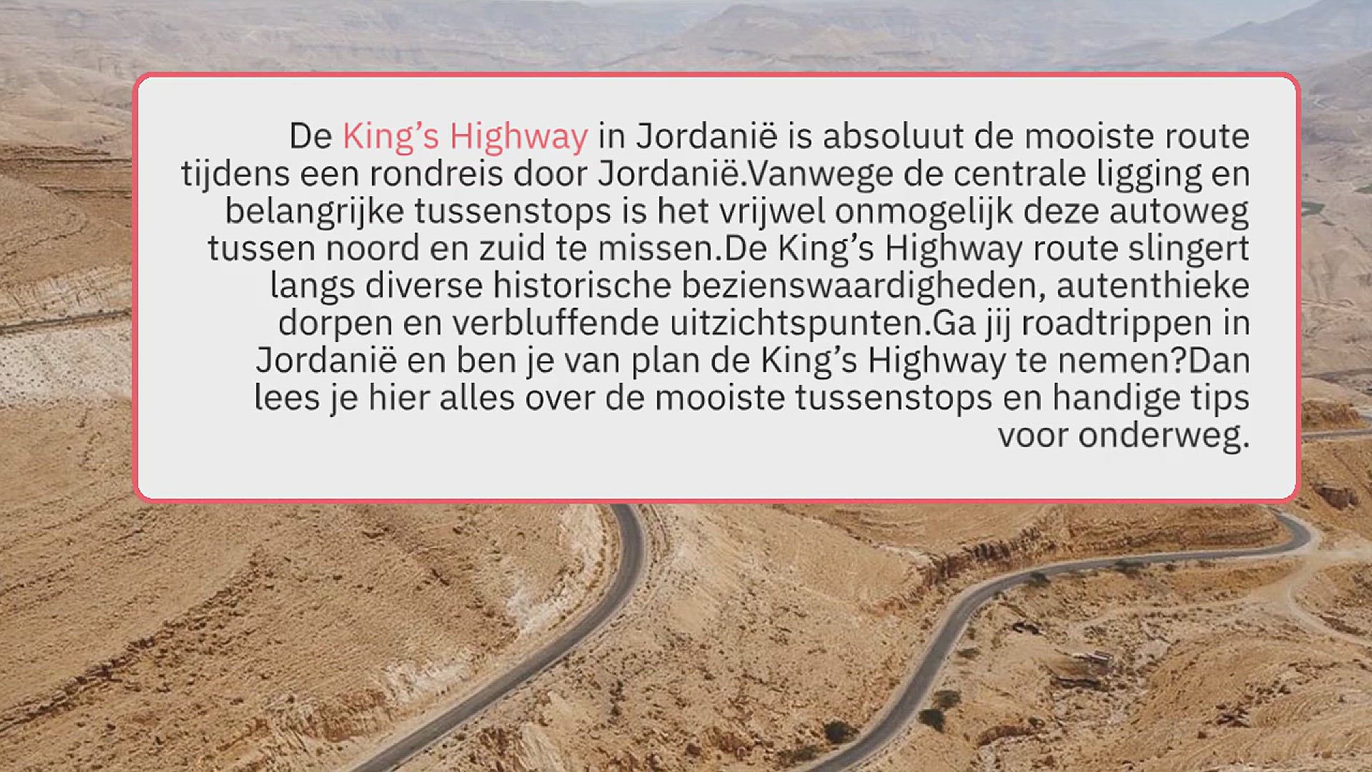 De King’s Highway in Jordanië is absoluut de mooiste route tijdens een rondreis door Jordanië. Vanwege de centrale ligging en belangrijke tussenstops is het vrijwel onmogelijk deze autoweg tussen noord en zuid te missen. De King’s Highway route slingert langs diverse historische bezienswaardigheden, autenthieke dorpen en verbluffende uitzichtspunten. Ga jij roadtrippen in Jordanië en ben je van plan de King’s Highway te nemen? Dan lees je hier alles over de mooiste tussenstops en handige tips voor onderweg.