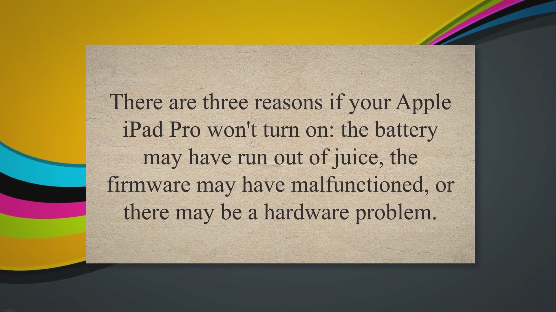 There are three reasons if your Apple iPad Pro wont turn on: the battery may have run out of juice, the firmware may have malfunctioned, or there may be a hardware problem. The best course of action in this situation is to rule out the first two options since, if after doing so, the gadget still wont power on, it is always the technicians responsibility to check it out and determine whether a hardware issue actually exists. Ill lead you through troubleshooting your iPad Pro in this video if it wont turn on.