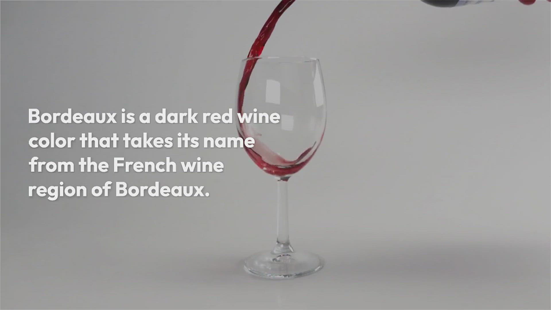 Bordeaux is a dark red wine color that takes its name from the French wine region of Bordeaux. While Bordeax wines range in shade from ruby to garnet to tawny, the quintessential Bordeaux color is a deep, rich red.