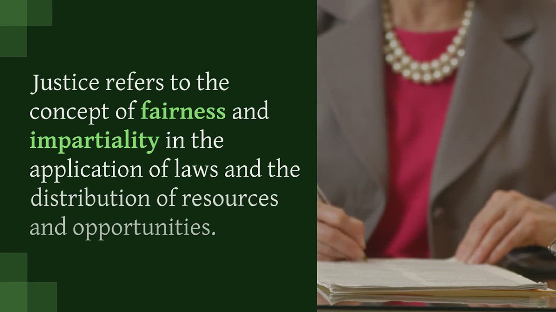Justice refers to the concept of fairness and impartiality in the application of laws and the distribution of resources and opportunities. It aims to uphold rights, ensure equality, and hold individuals accountable for their actions. It is a fundamental principle in societies to maintain order and harmony.