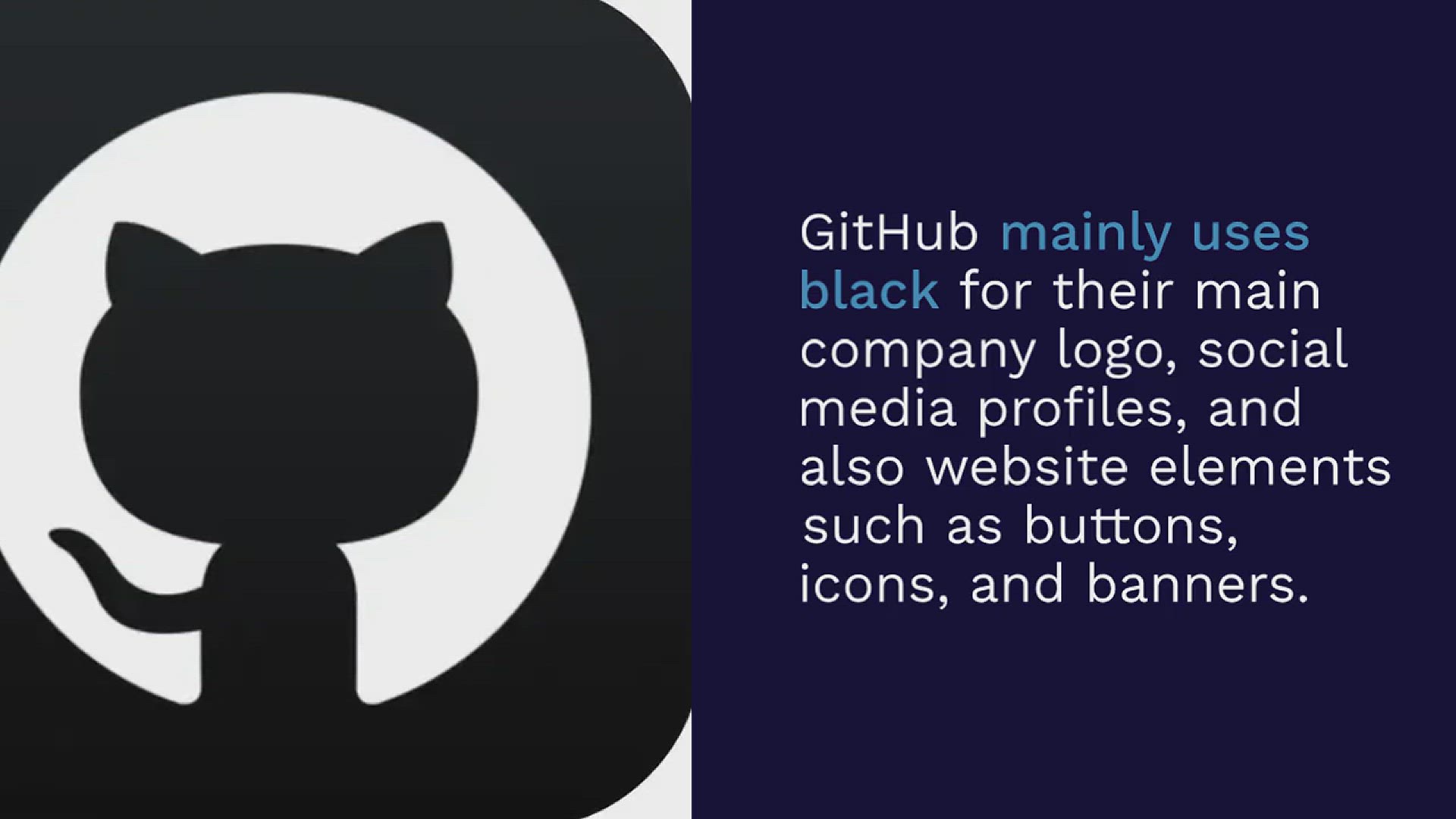 GitHub mainly uses black for their main company logo, social media profiles, and also website elements such as buttons, icons, and banners.