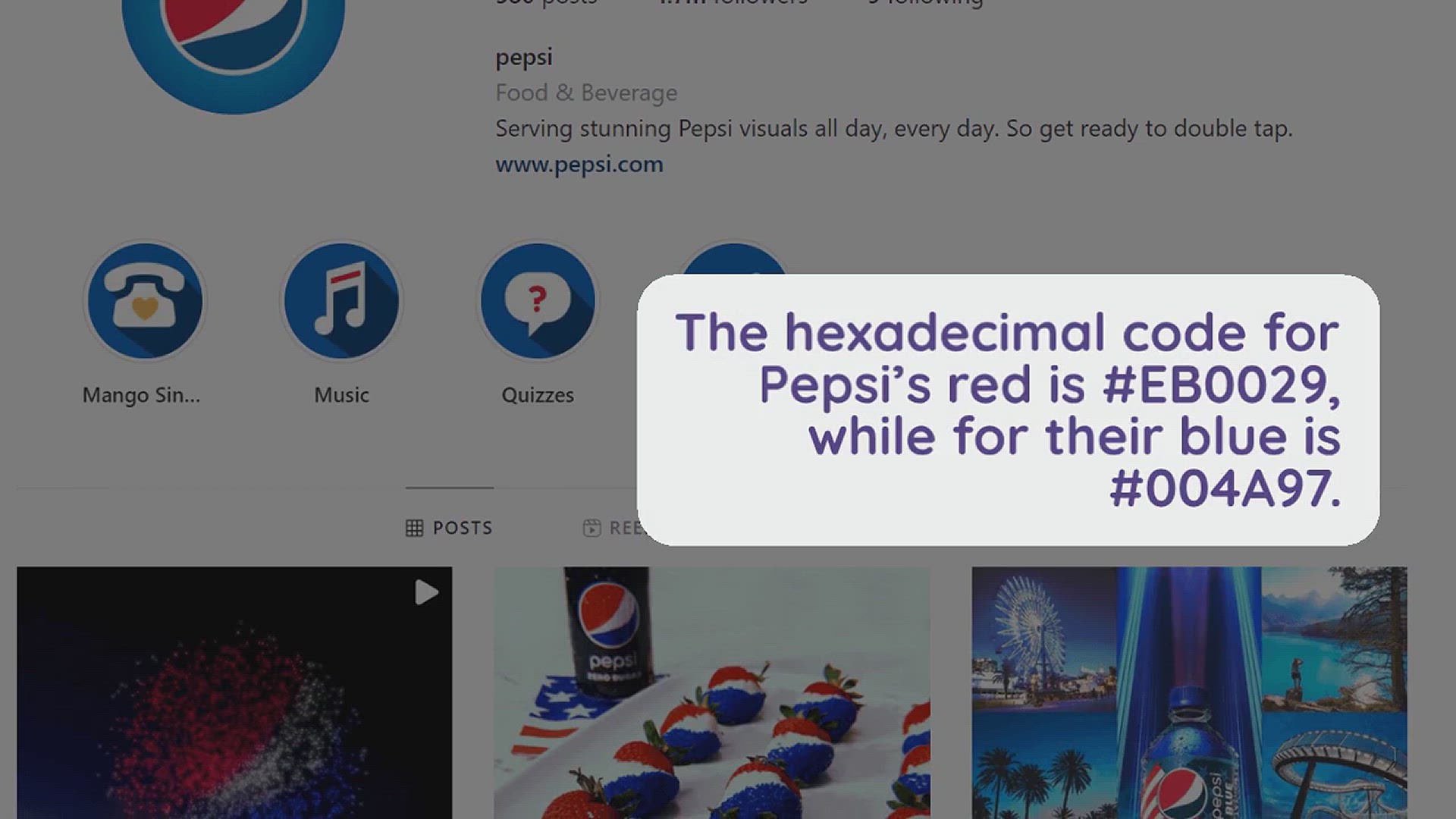 Pepsi mainly uses red and blue for their main company logo, social media pages, and also website elements such as buttons, icons, and banners.The hexadecimal code for Pepsi’s red is #EB0029, while for their blue is #004A97.