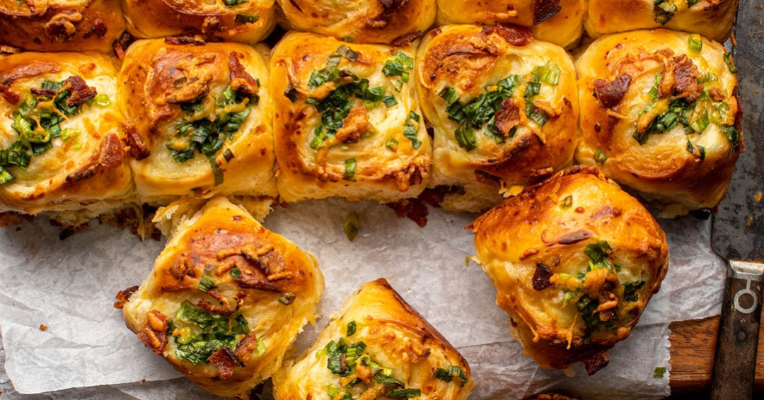 These bacon cheddar scallion milk buns are incredibly soft and topped with crispy bacon, scallions, and cheddar for the perfect snack!