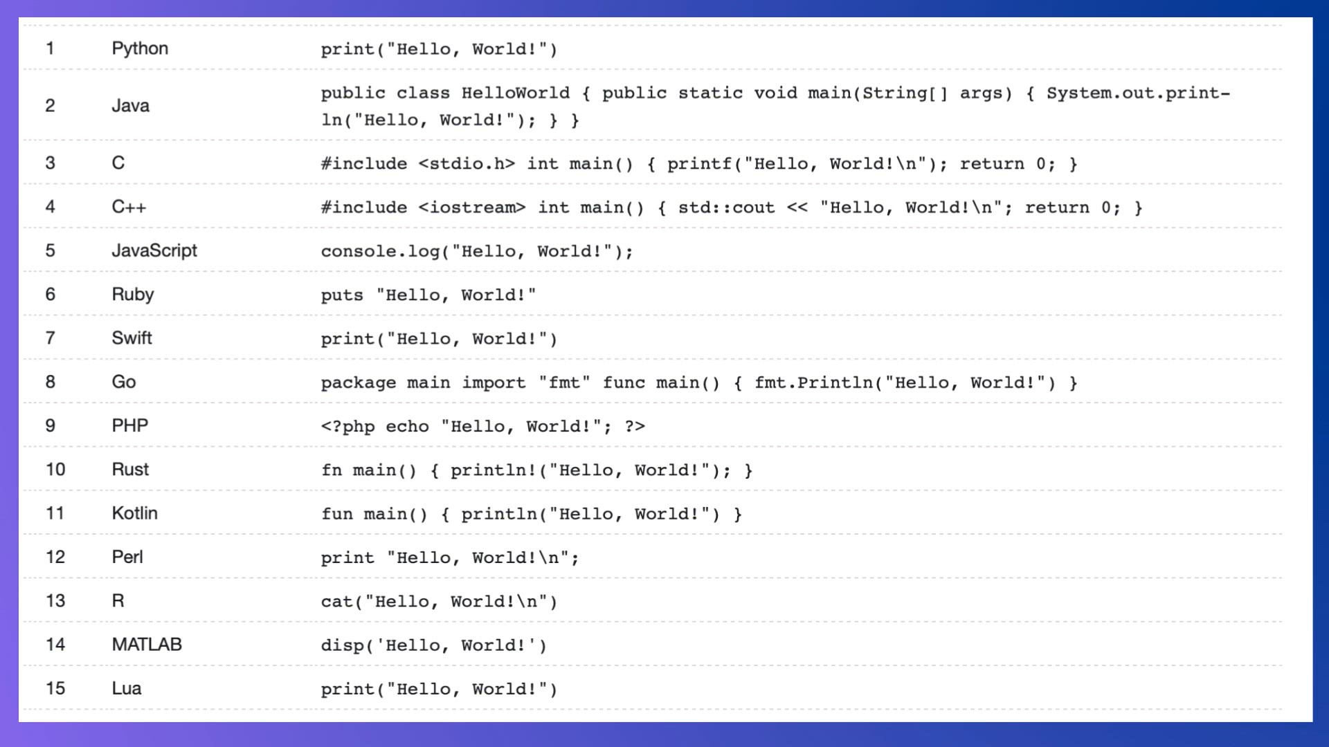 Lets take a look at over Hello World! Examples for over 50+ Programming Languages. Python Java C C++ JavaScript Ruby Swift Go PHP Rust Kotlin Perl R MATLAB Lua Bash HTML CSS
