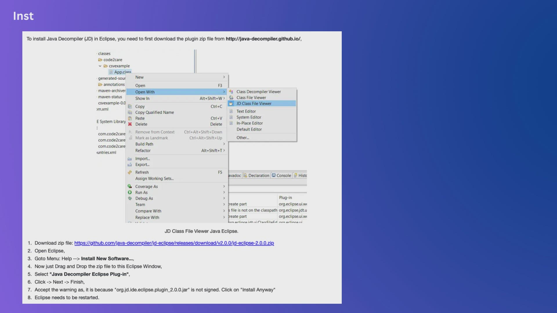 Installing JD Decompiler plugin in Eclipse IDE