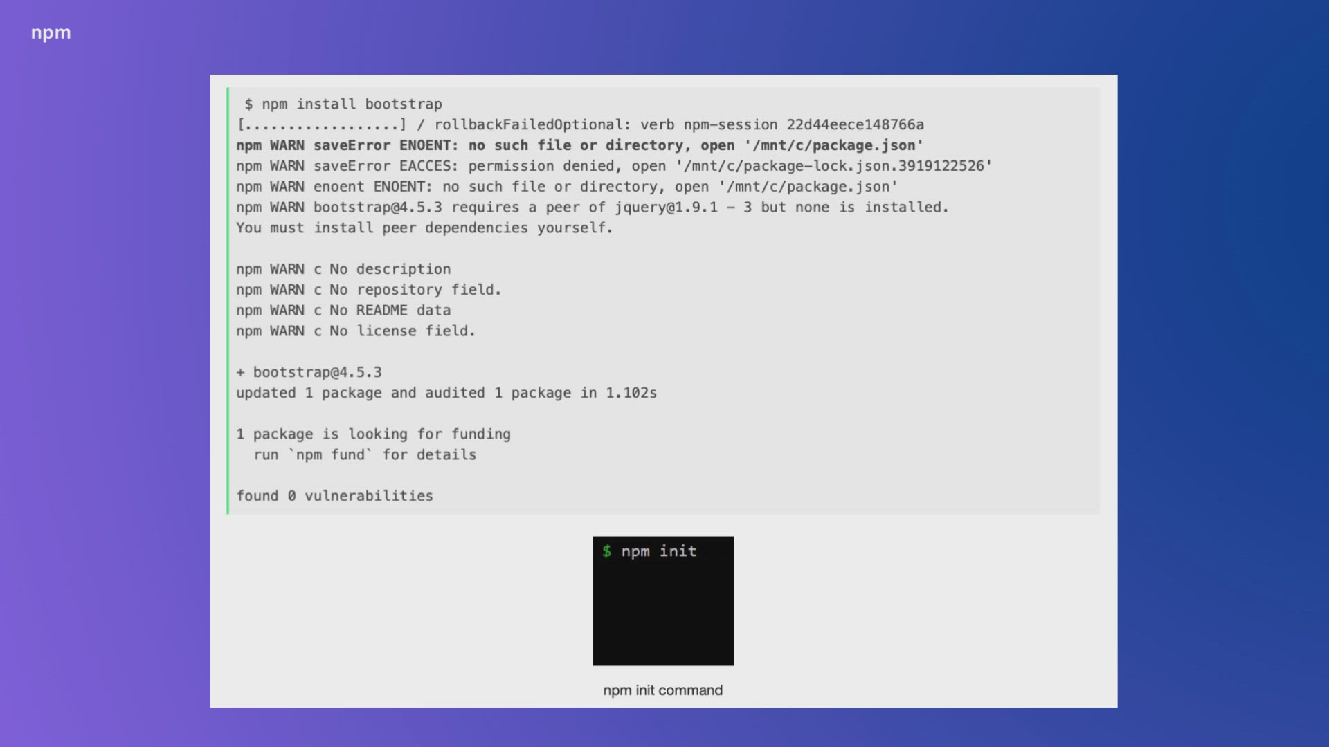 npm WARN saveError ENOENT no such file or directory, open mntcpackage.json