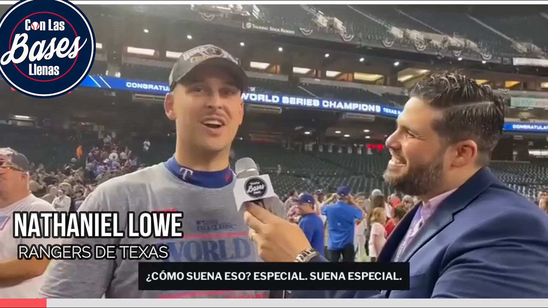 World Series Champion Nathaniel Lowe talks to us from the field while celebrating his championship with the Texas Rangers.