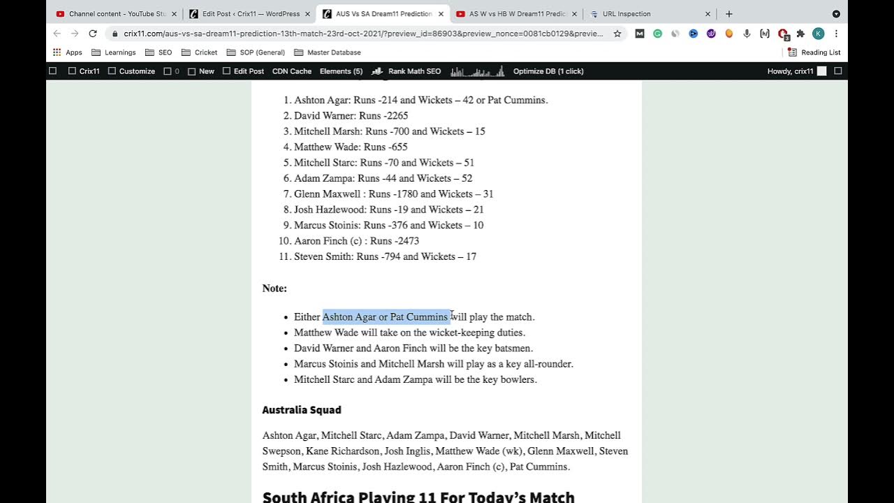 In this video, you will get all the details of AUS vs SA Dream11 Team.