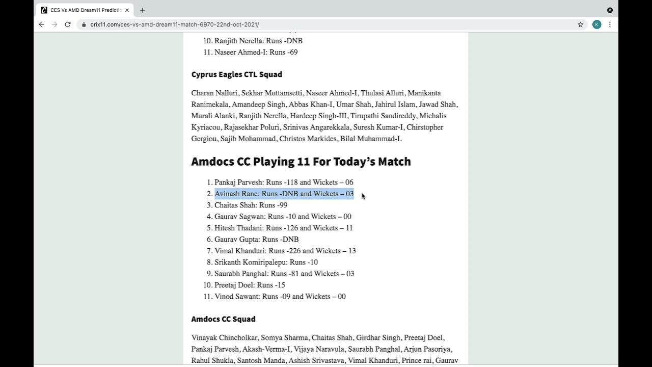 In this Video you will get all the information of CES vs AMD Dream11 Team.