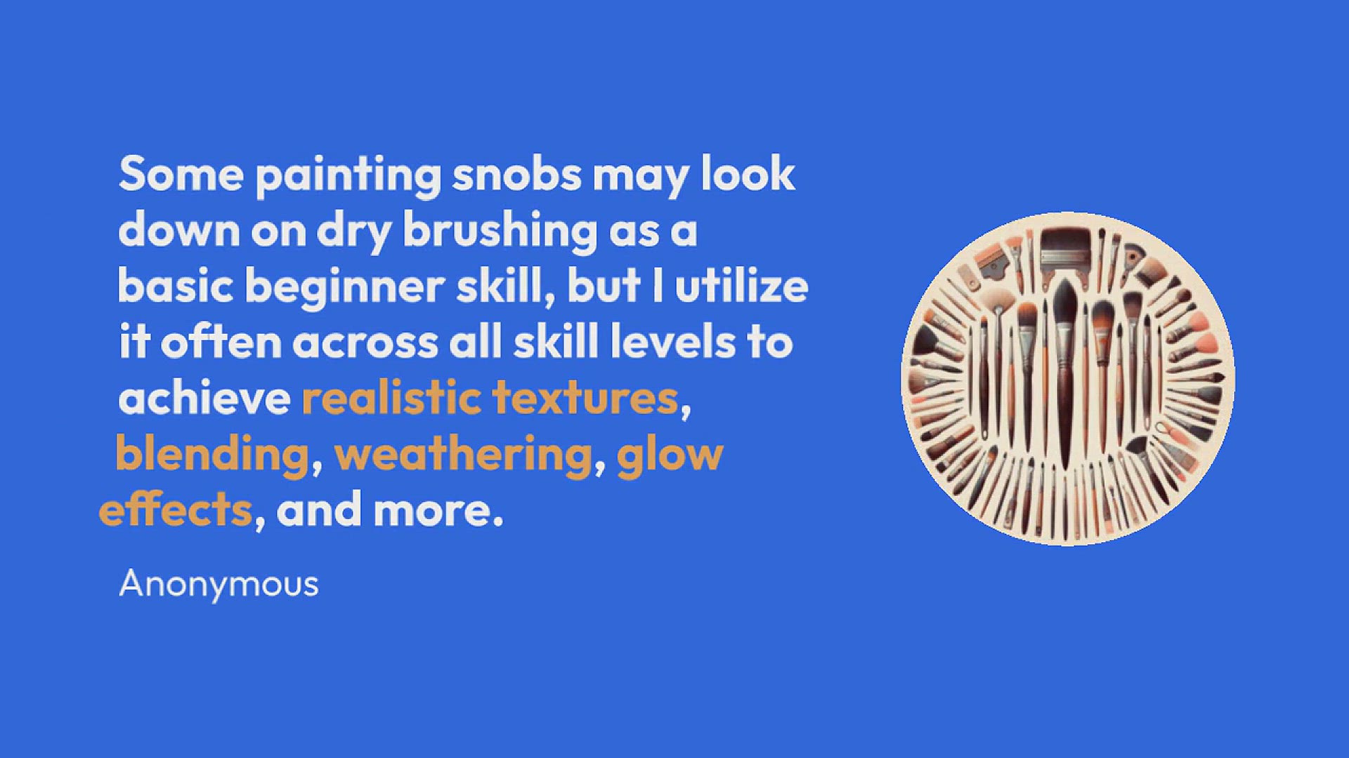 Some painting snobs may look down on dry brushing as a basic beginner skill, but I utilize it often across all skill levels to achieve realistic textures, blending, weathering, glow effects, and more. This technique truly shines when highlighting the intricate textures of things like fur, skin, chainmail, sand, stone, gravel, hair – any surface with defined edges and recesses.