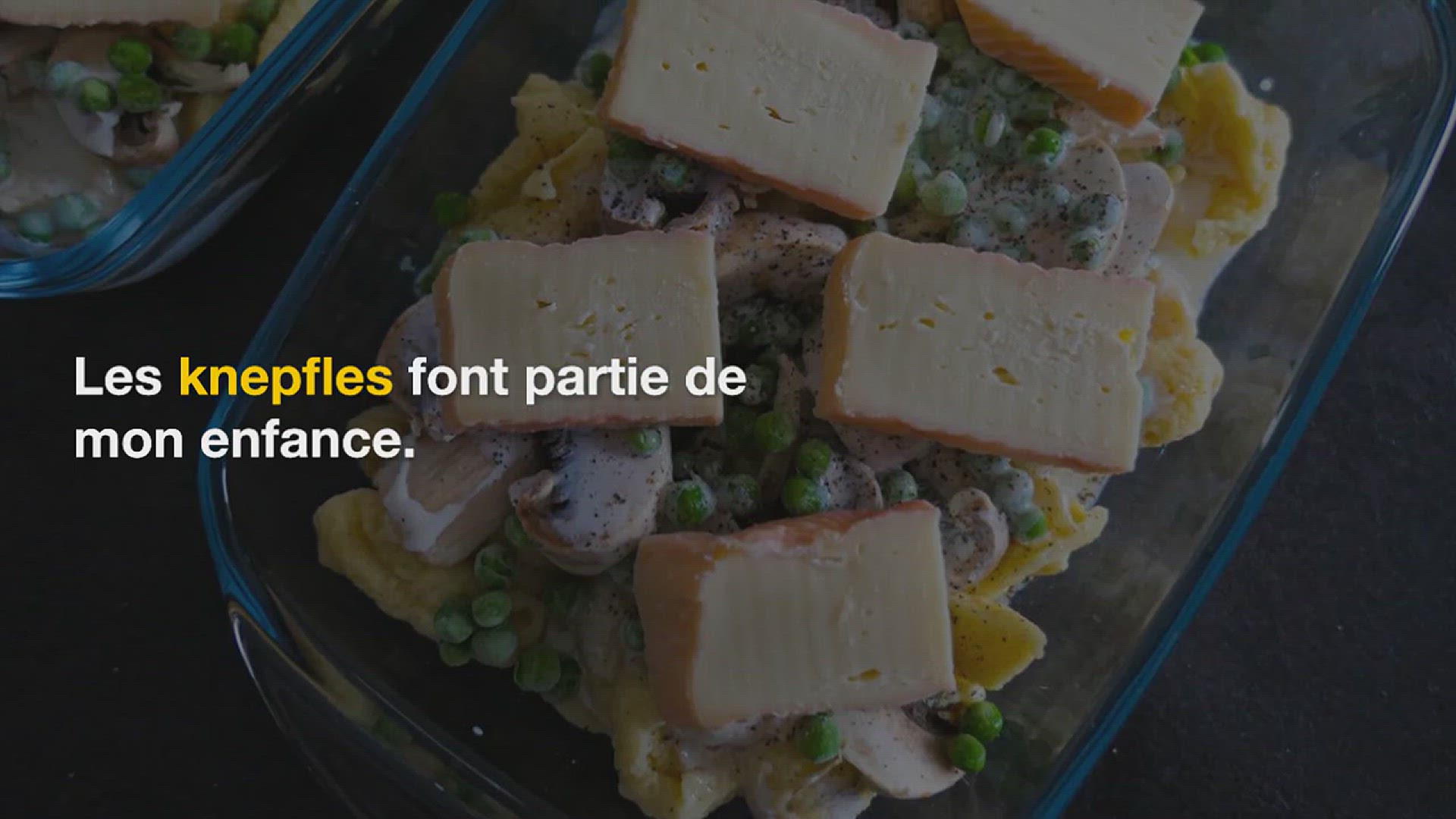 Gratin de knepfles au munster, champignons et petits pois