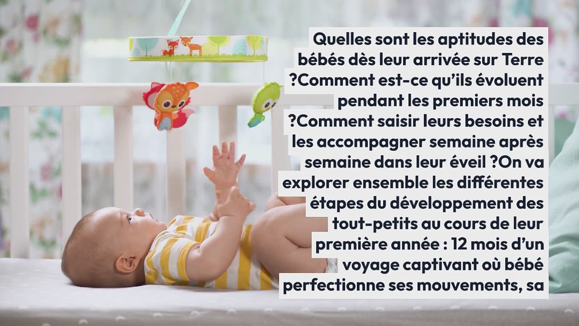 Quelles sont les aptitudes des bébés dès leur arrivée sur Terre ? Comment est-ce qu’ils évoluent pendant les premiers mois ? Comment saisir leurs besoins et les accompagner semaine après semaine dans leur éveil ? On va explorer ensemble les différentes étapes du développement des tout-petits au cours de leur première année : 12 mois d’un voyage captivant où bébé perfectionne ses mouvements, sa parole et ses interactions avec les autres.