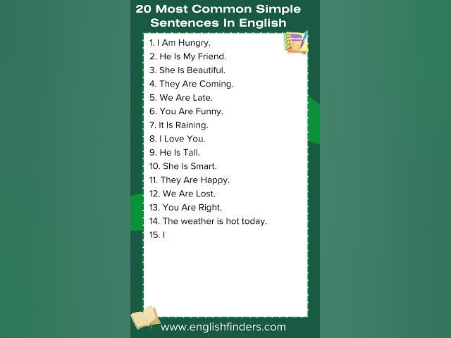 In this short video, we'll be taking a look at 20 of the most common simple English sentences. These sentences will help you gain a better understanding of the language and improve your speaking skills. If you're looking to improve your English skills, then be sure to check out this short video! By learning these simple sentences, you'll quickly become a better speaker and understander of the English language! #youtubeshorts #shortvideo #englishgrammar