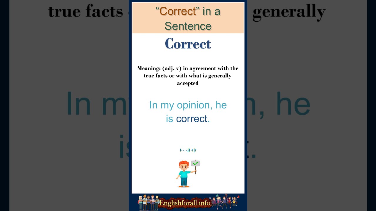 ☑ Check your English level https://englishforall.info/english-quizzes/ ☑ Correct meaning: (adj, v) in agreement with the true facts or with what is generally accepted ☑ Correct in a Sentence: - These answers are correct. - In my opinion, he is correct. - Please correct the following sentence. ---------------------------------------------------------------------------------------- ☑WATCH MORE: ★ Most Common Words Playlist http://bit.ly/3mTYBJD ★English Vocabulary Playlist: https://bit.ly/2TdcwPs ★Color Vocabulary: https://youtu.be/UgcdV6Oesoc ★Animal Vocabulary: https://youtu.be/oUrUN0BJUN8 ★Body Movement Verbs: https://youtu.be/cN_82aRMY44 ★English Vocabulary Playlist: https://bit.ly/2TdcwPs ★Vehicle Vocabulary: https://youtu.be/pYrxcgB3plc ---------------------------------------------------------------------------------------- OUR SOCIAL MEDIA: Pinterest: https://www.pinterest.com/englishforall101/ Facebook: https://www.facebook.com/englishforall.info/ Instagram: https://www.instagram.com/englishforall.info/