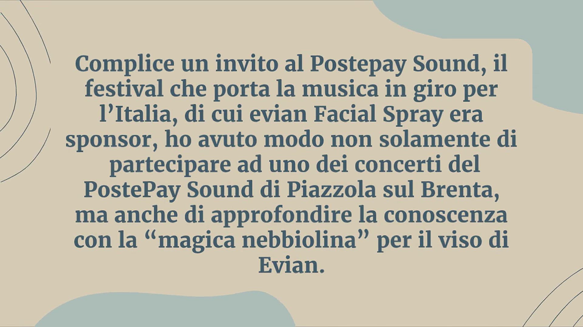 evian facial spray: un prodotto amatissimo da beauty addicted e make-up artist, ma forse non ben conosciuto da tutte noi. Complice un invito al Postepay Sound, il festival che porta la musica in giro per l’Italia, di cui evian Facial Spray era sponsor, ho avuto modo non solamente di partecipare ad uno dei concerti del PostePay Sound di Piazzola sul Brenta, ma anche di approfondire la conoscenza con la “magica nebbiolina” per il viso di Evian.
