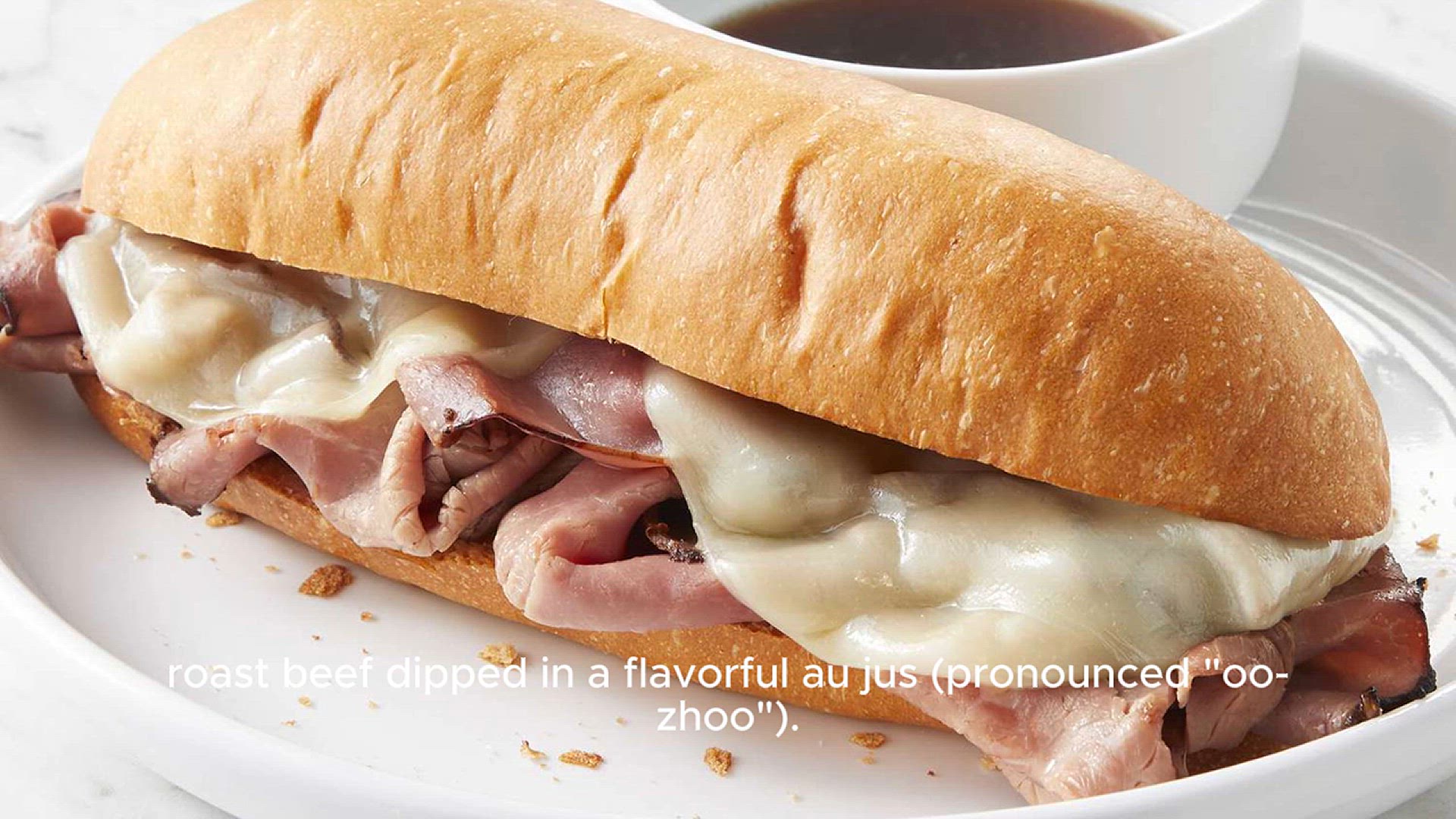 A French dip recipe featuring tender roast beef served on a hoagie roll with melted cheese, accompanied by a savory au jus for dipping, making a hearty and classic sandwich.