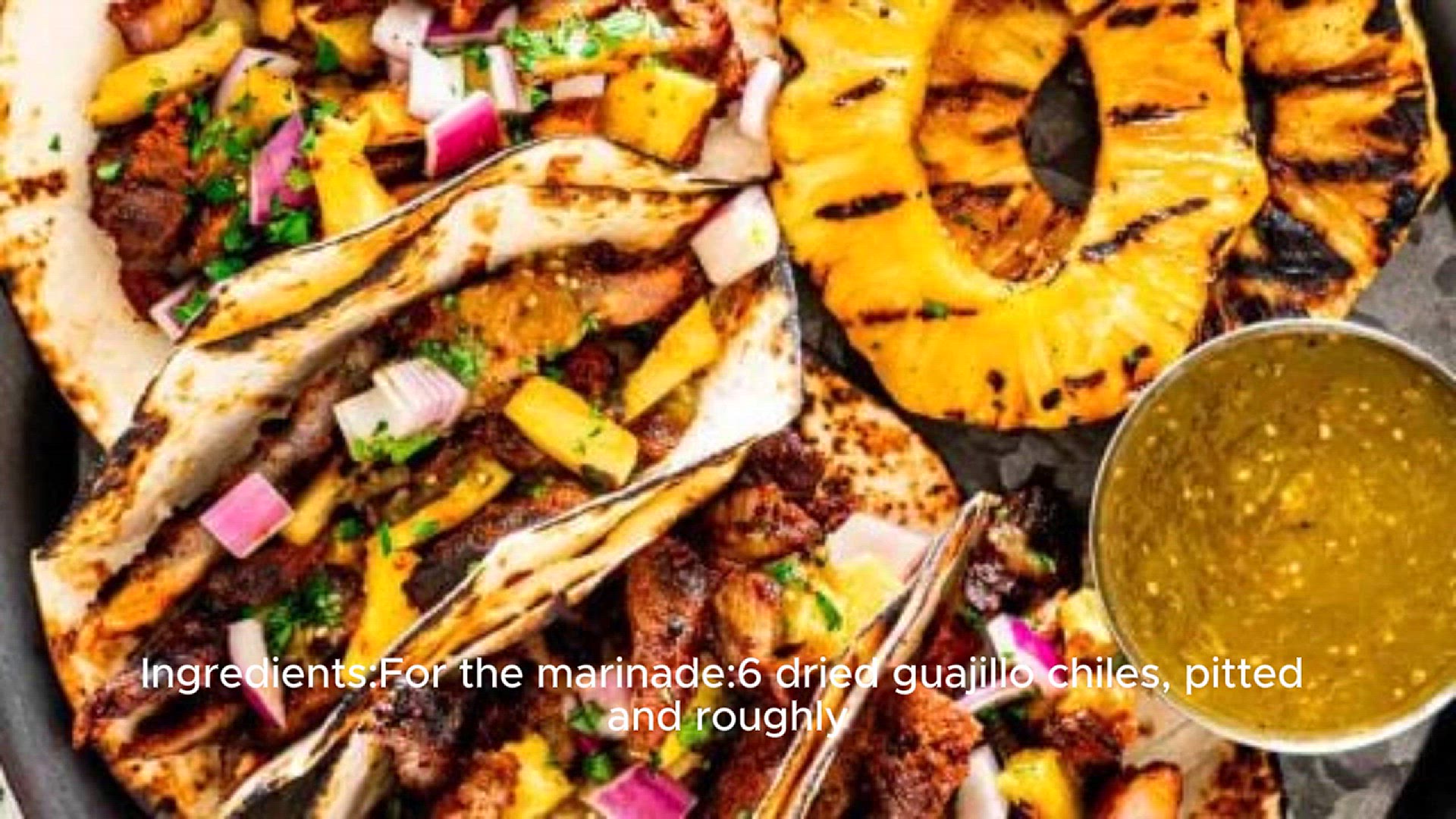 Here's a traditional Al pastor recipe featuring marinated pork with pineapple and adobo sauce, a flavorful staple of Mexican cuisine known for its spicy and savory flavors, often served in tacos or as street food.