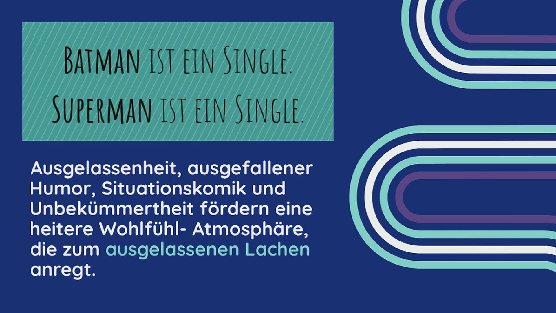 Ausgelassenheit, ausgefallener Humor, Situationskomik und Unbekümmertheit fördern eine heitere Wohlfühl- Atmosphäre, die zum ausgelassenen Lachen anregt. Lustige Sprüche zum Totlachen wecken in uns ungewöhnliche Reaktionen, die Freude, Spaß und Leichtigkeit befeuern, uns die Tränen in die Augen treiben und dafür sorgen, dass unser Lachen nicht abebbt. Derartig lustige Sprüche dienen als “ kleine Fluchten aus dem Alltag“.
