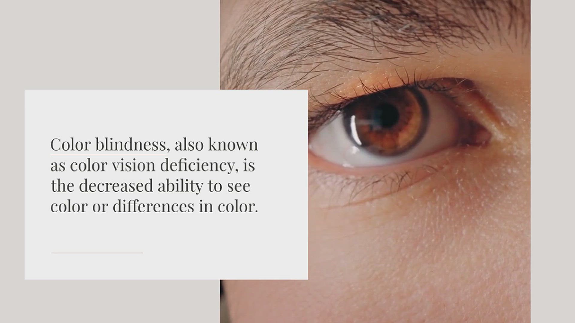 Color blindness, also known as color vision deficiency, is the decreased ability to see color or differences in color. It is most often an inherited genetic disorder, but can also be acquired later in life due to disease or injury to the eye, optic nerve, or parts of the brain.