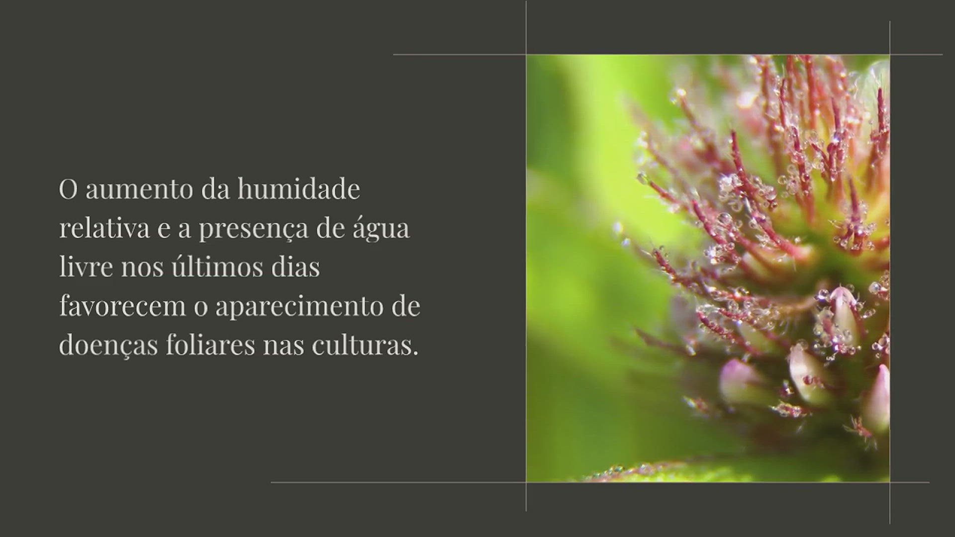 O aumento da humidade relativa e a presença de água livre nos últimos dias favorecem o aparecimento de doenças foliares nas culturas. A podridão cinzenta, causada por Botrytis cinerea, é uma das doenças mais comuns e amplamente distribuídas, ocorrendo em produtos hortícolas, árvores de fruto, plantas ornamentais e campos de cultivo em todo o mundo.