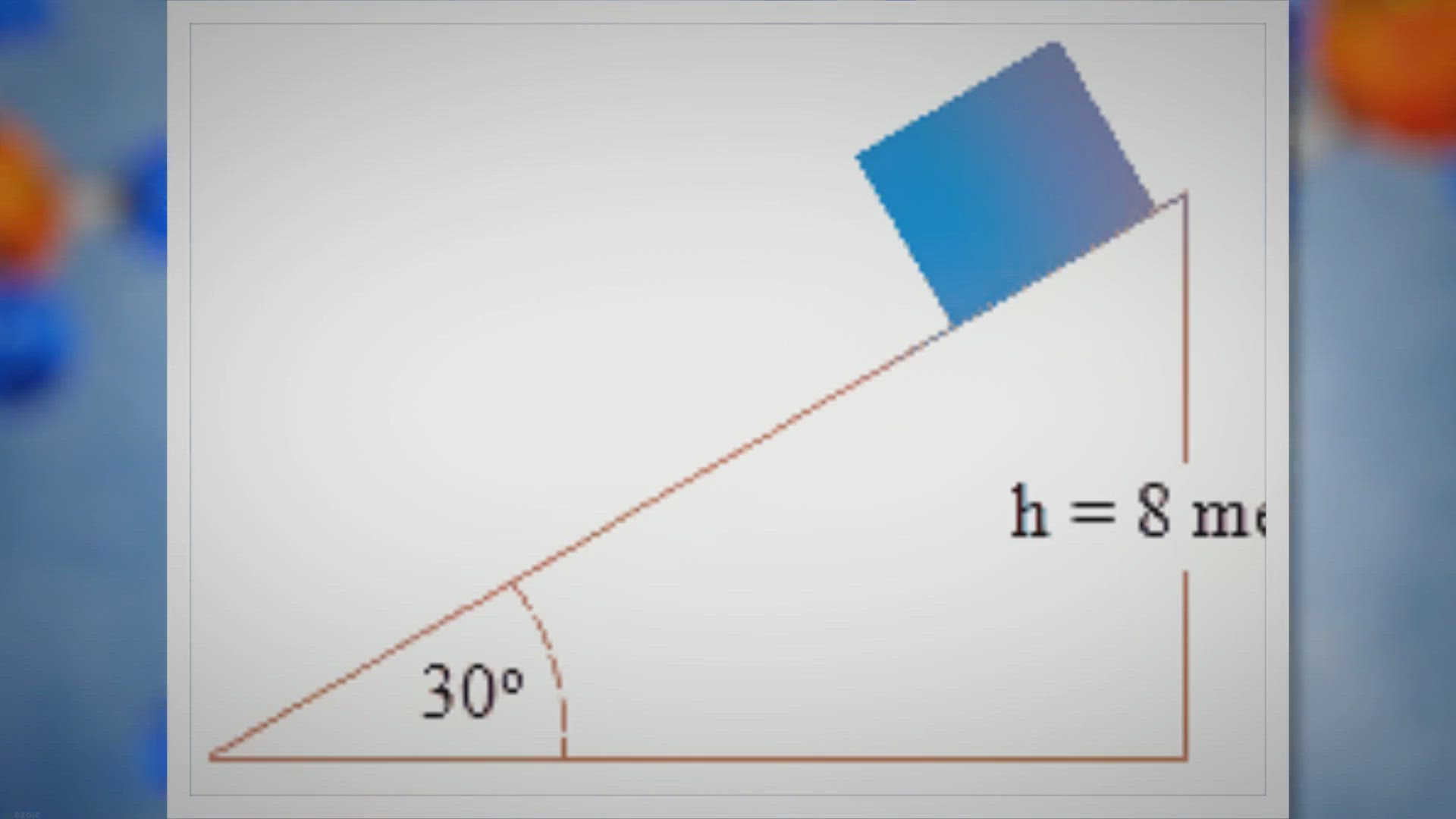 1. A block slides down on smooth inclined plane without friction. What is block's velocity when hits the ground. Acceleration due to gravity is 10 m/s2