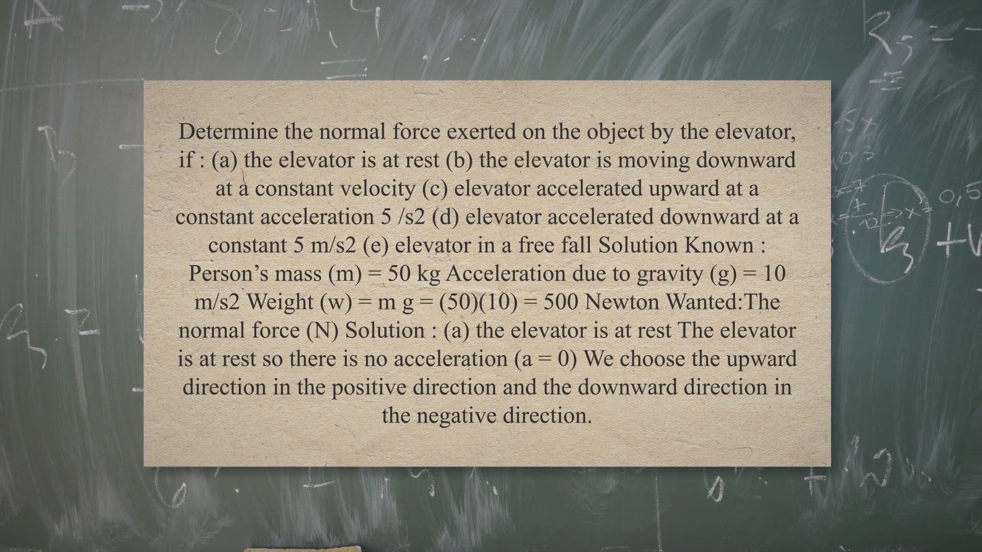 1. A 50-kg person in an elevator. Acceleration due to gravity = 10 m/s2. Determine the normal force exerted on the object by the elevator, if :