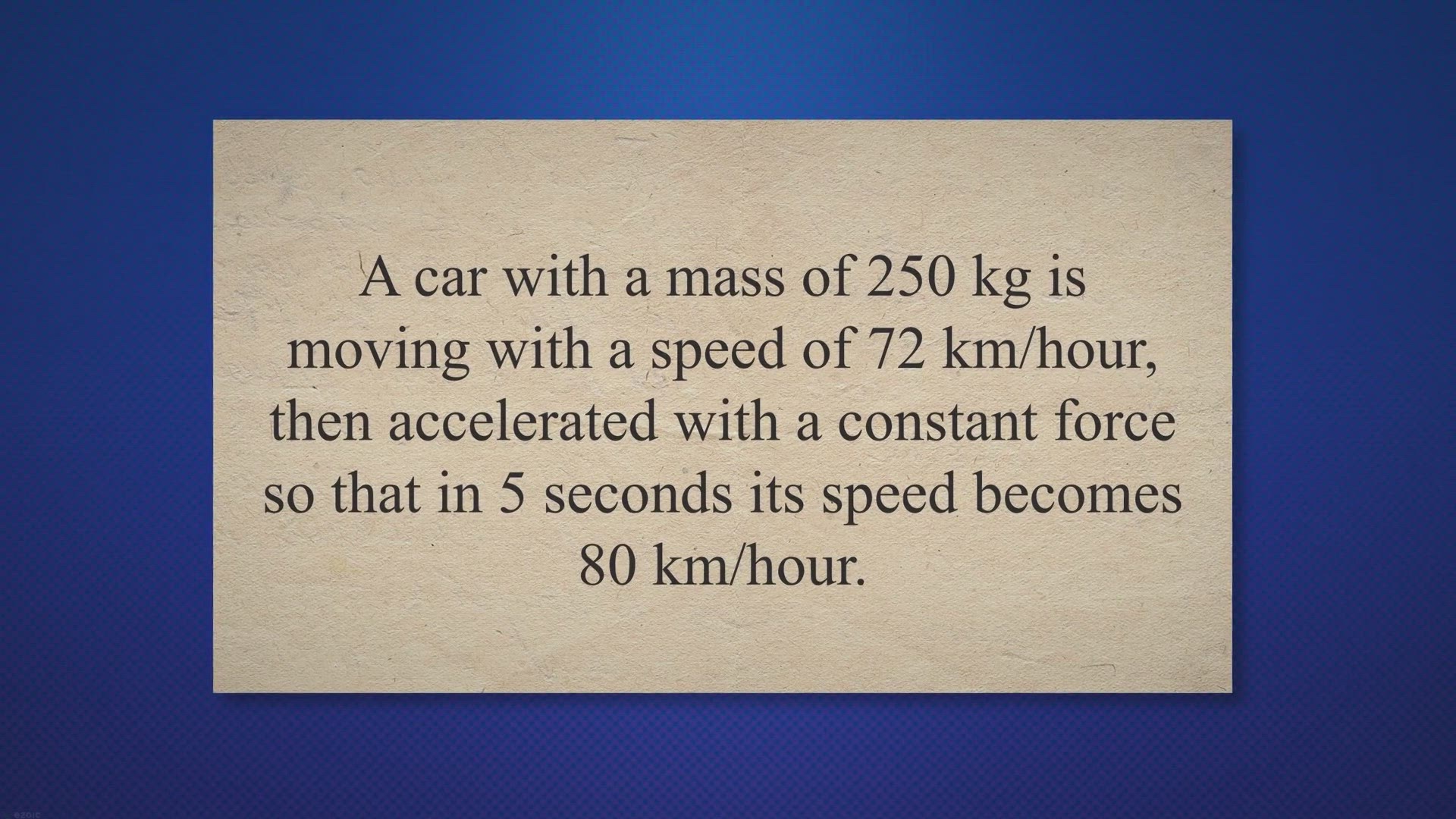 1. A car with a mass of 250 kg is moving with a speed of 72 km/hour, then accelerated with a constant force so that in 5 seconds its speed becomes 80 km/hour.
