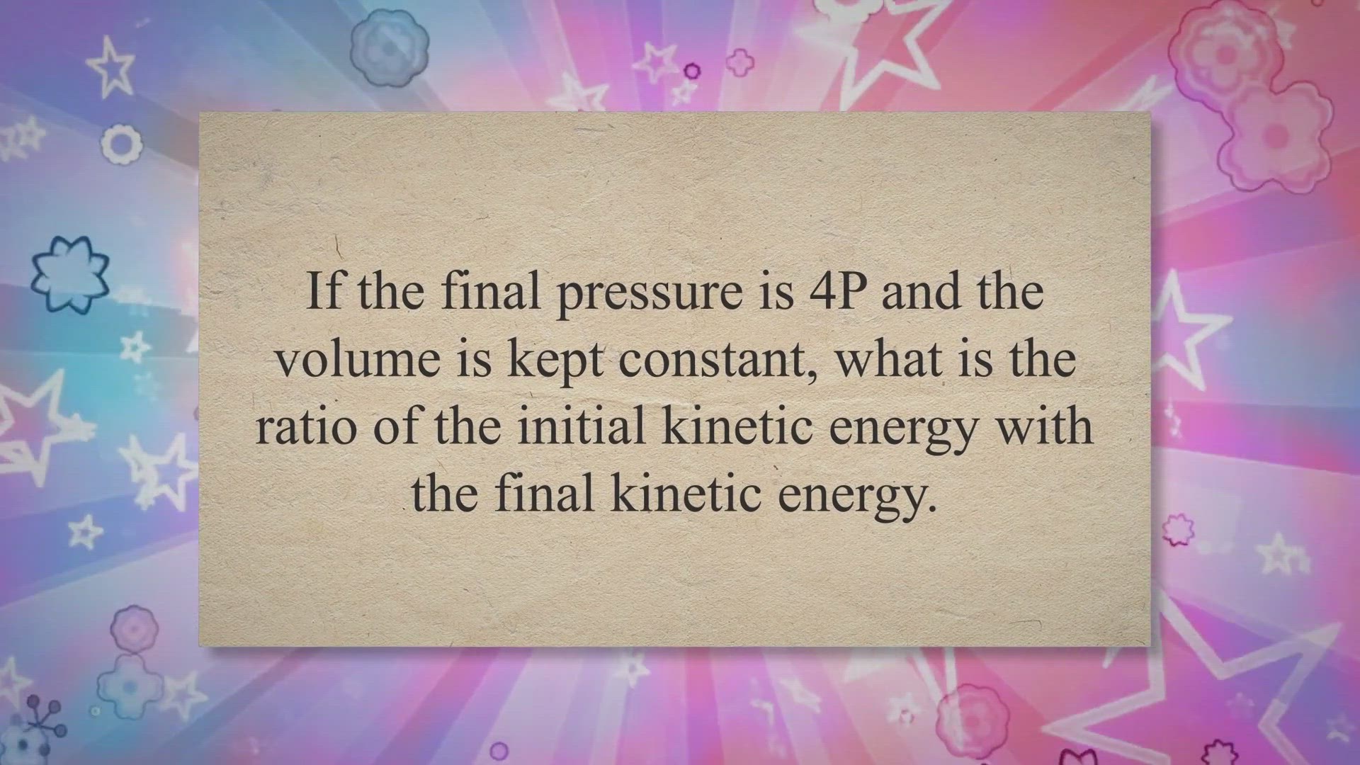1. Ideal gases in a closed container initially have volume V and pressure P. If the final pressure is 4P and the volume is kept constant, what is the ratio of