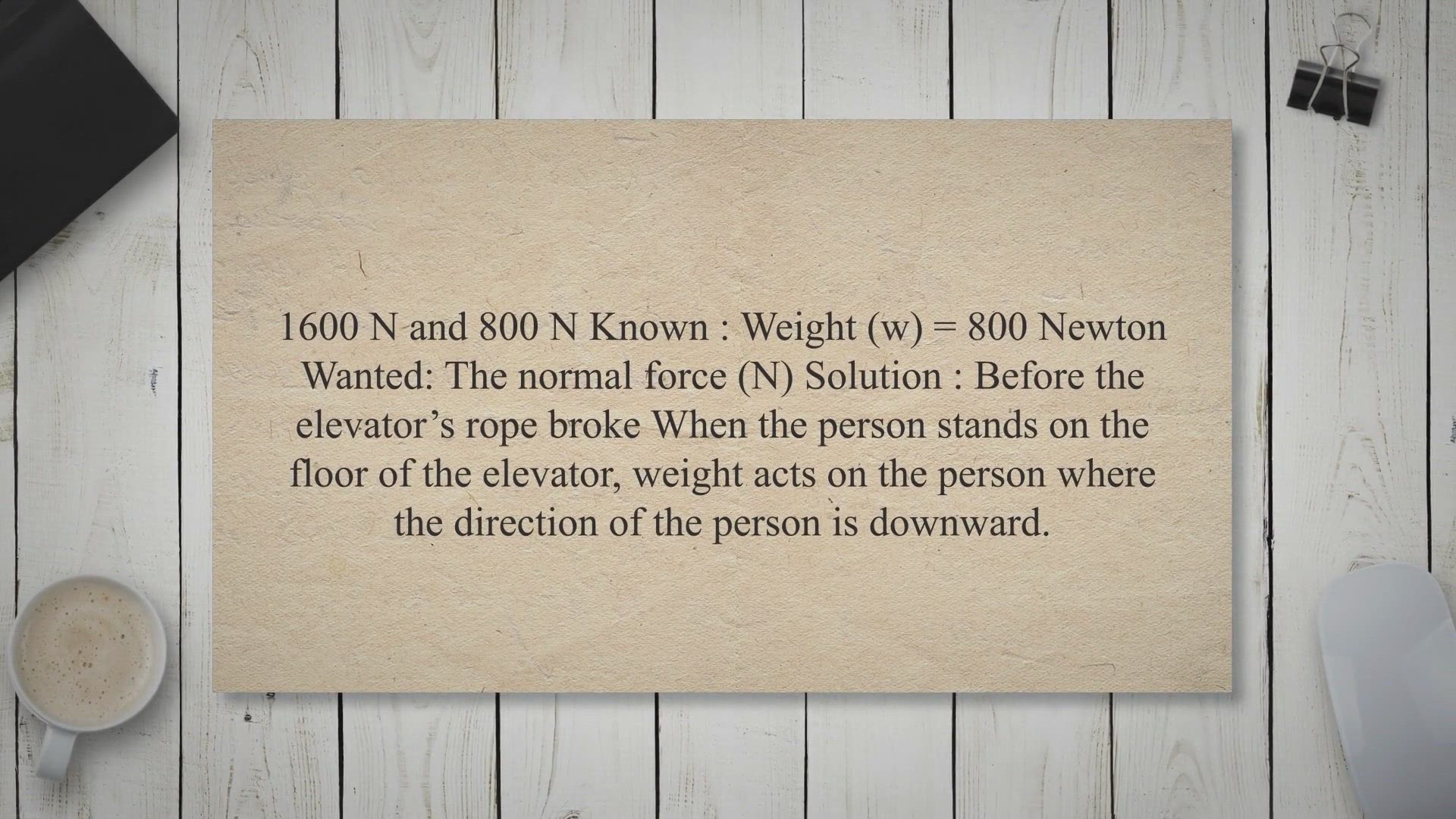 1. A person is in an elevator that moving upward at a constant velocity. The weight of the person is 800 N. Immediately the elevator rope is broke, so the