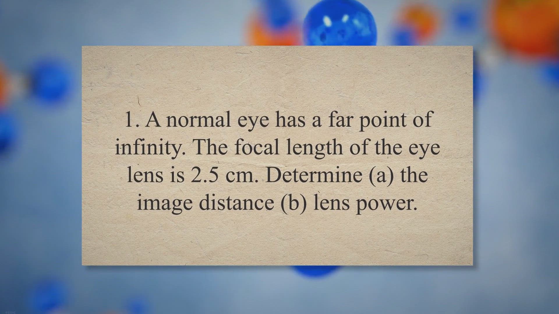 1. A normal eye has a far point of infinity. The focal length of the eye lens is 2.5 cm. Determine (a) the image distance (b) lens power.
