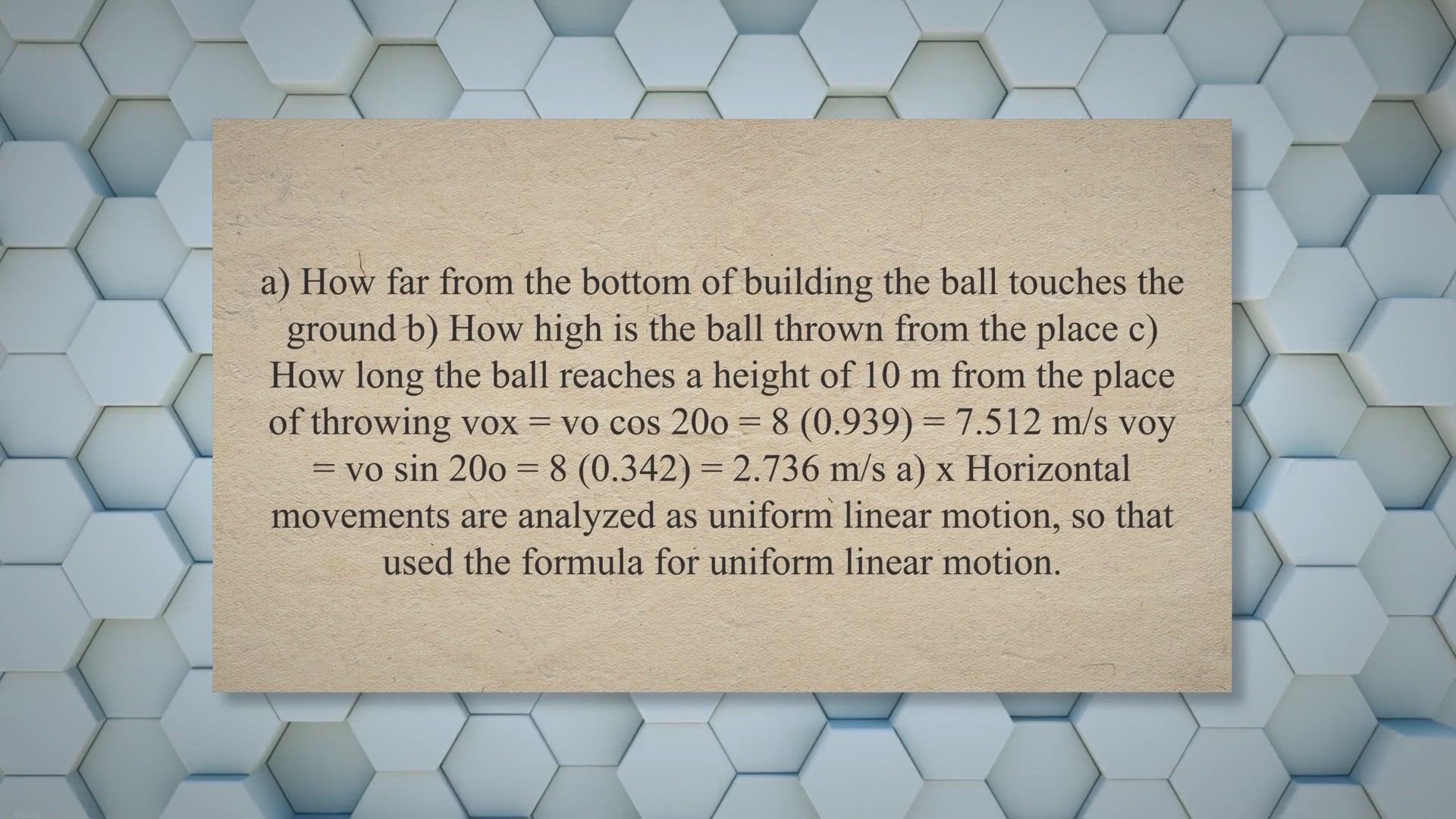 Parabolic motion Work and kinetic energy Linear momentum Linear and angular motion Problems and Solutions
