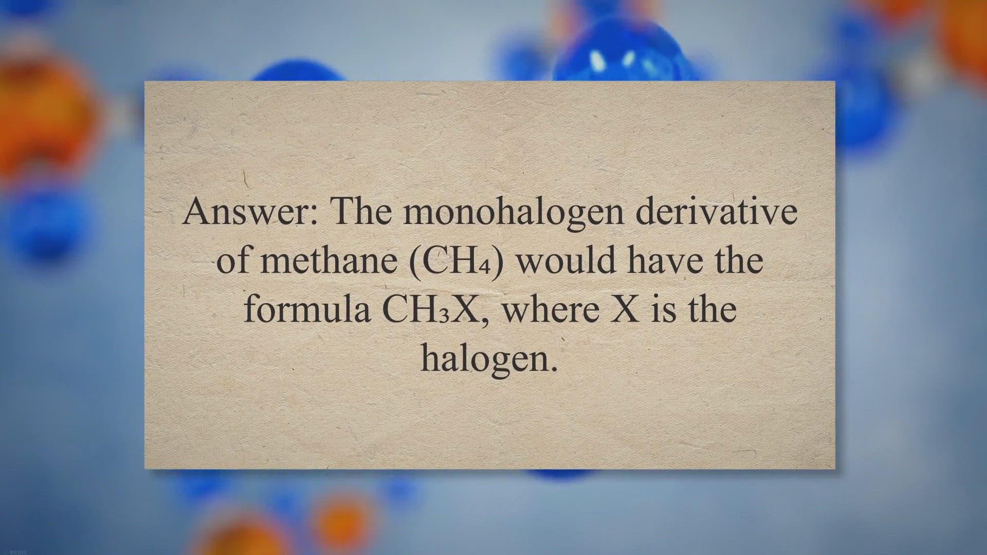 Question: What is the molecular formula of a monohalogen derivative of methane? Answer: The monohalogen derivative of methane (CH₄) would have the formula