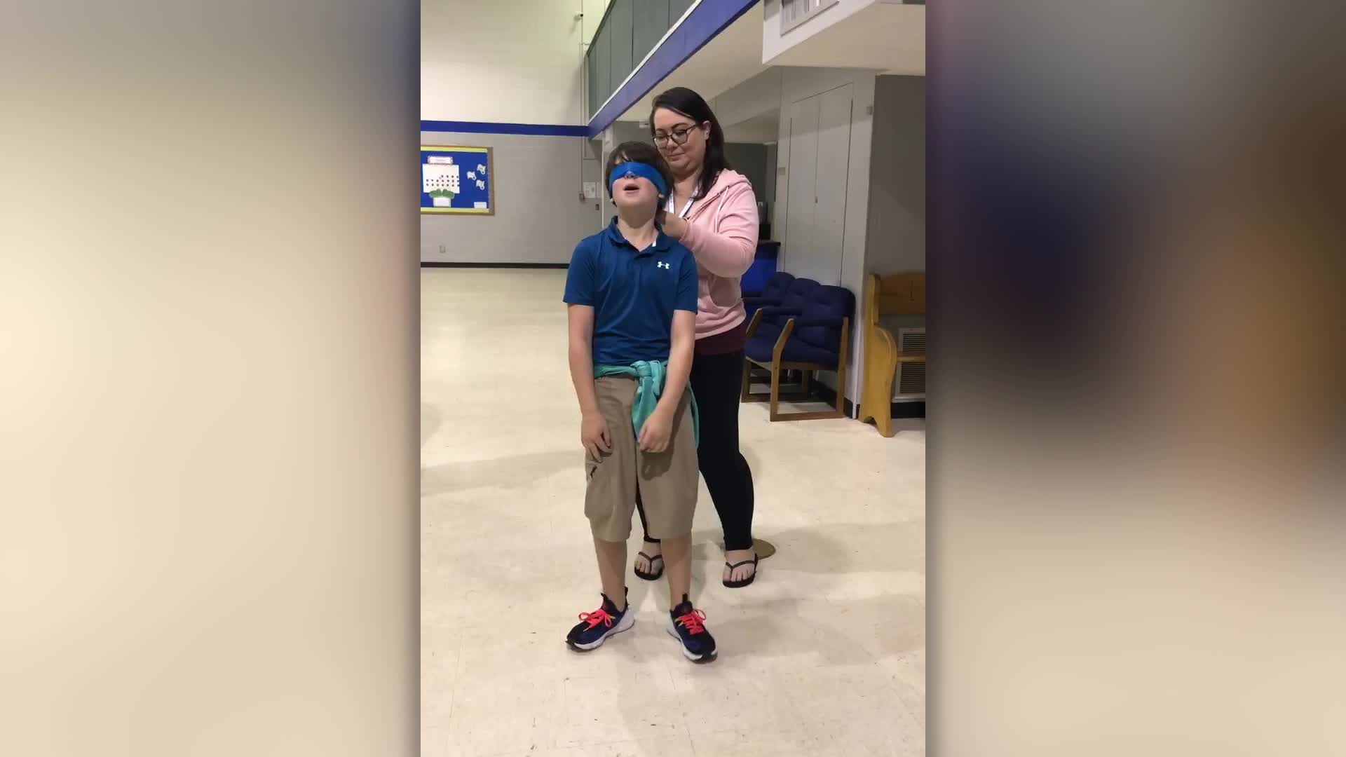 A stunned youngster almost fell over in shock as he removed a blindfold to discover his Air Force dad had returned from the Middle East and was standing behind him. Trey Smith, aged nine, was blindfolded and asked to spin around a number of times, not knowing what surprise his teachers at Antioch Christian Academy in Oklahoma City had in store. Trey’s father, Tim Smith, had been serving with the USAF in the Middle East, but had returned from duty early - unbeknownst to Trey, who was completely oblivious to the surprise. After spinning around and removing the blindfold, Trey stumbled back as he double-took who was standing in front of him, immediately jumping into his father’s arms for a huge hug. The surprise was organized with the help if Tim’s wife, Brandi, and the school’s headmaster, David Herren, who arranged for Tim to greet his son at afternoon dismissal on August 20.