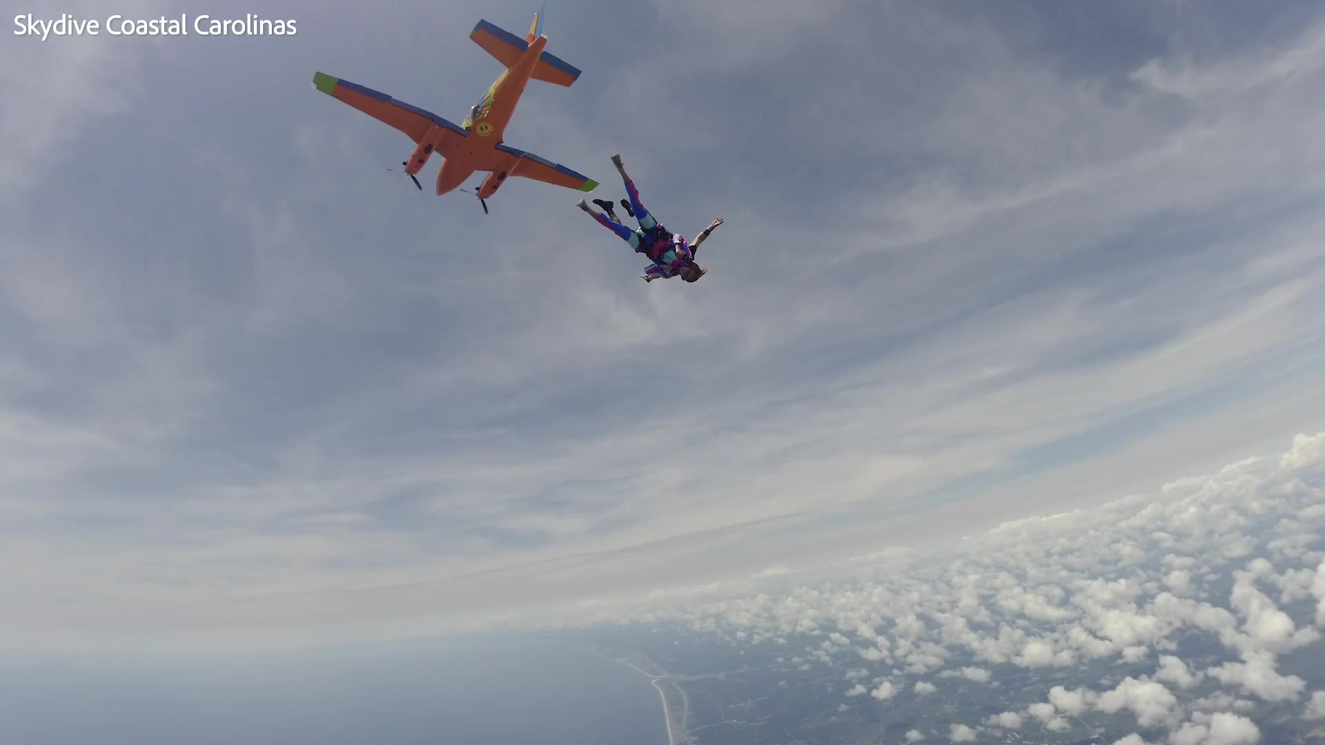 A father-to-be who is scared of heights discovered the sex of his baby through his first ever skydive. In the adrenaline-pumping clip, Tim Goodwin hurtles towards the ground above North Carolina, totally oblivious about the sex of the baby he and fiancé Angela Hewett are due to have. Staff at Skydive Coastal Carolinas had received a sonogram revealing the gender of Tim and Angela's baby, and so, mid-freefall, two fellow divers set off pink smoke bombs to let the delighted couple know they are set to have a girl. On the ground, pink smoke bombs were also set off on the landing strip, which provided a grand landing for ecstatic Tim. Tim, 24 - who had never skydived before the May 11 jump - admitted he had to convince Angela, 29, over letting him skydive. But she relented after he’d been through the safety procedures and he finally landed in a plume of pink smoke, revealing it was totally worth it.