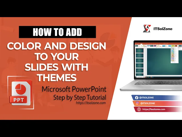 How to Add Color and Design to Your Slides with Themes in PowerPoint | Steb By Step | Tutorial In this video, you will learn how to use Themes in Microsoft PowerPoint to add color and design to your slides. We will cover the basics of Themes, including how to apply them to your slides and how to customize them to suit your needs. Themes are a great way to give your slides a professional look without spending a lot of time on design. With Themes, you can quickly and easily apply a set of coordinated colors, fonts, and effects to your entire presentation. We will show you how to browse and select a Theme from PowerPoint's built-in Themes gallery, and how to customize it with your own colors, fonts, and effects. ------------------------------------------------------------------------------------------------------- Social Media Links: Follow us on ------------------------------------------------------------------------------------------------------- Official Website: https://www.itsolzone.com/ Facebook: https://www.facebook.com/itsolzone/ Instagram: https://www.instagram.com/itsolzone/ Tiktok: https://www.tiktok.com/@itsolzone Snack Video: https://sck.io/u/Vn7z7d55 ------------------------------------------------------------------------------------------------------- If you found this tutorial helpful, please give it a thumbs up and consider subscribing to our channel for more PowerPoint tips and tricks. Don't forget to share this video with anyone you think might find it useful! #PowerPointTips #WatermarkTutorial #MicrosoftOffice #PresentationDesign #MicrosoftPowerPoint#PowerPointThemes #PowerPointDesign #ProfessionalDesign #PowerPointTips #MicrosoftPowerPoint