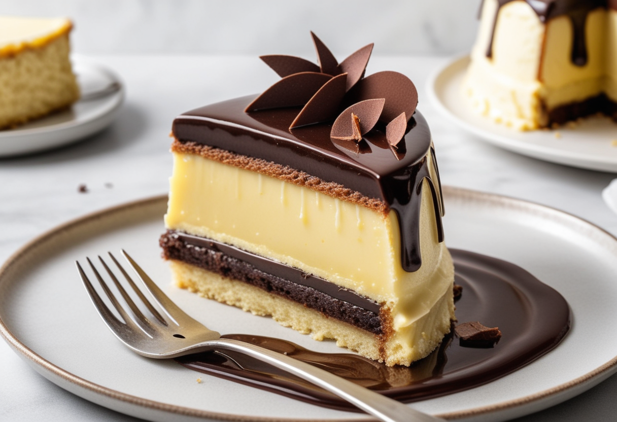 Boston Cream Dessert is a classic American dessert, despite its name, it's actually a cake, not a pie. This delightful treat features layers of light, fluffy sponge cake filled with a rich and creamy vanilla custard, all topped with a smooth, glossy chocolate ganache. The combination of textures and flavors makes it a perfect dessert for any special occasion or as an indulgent treat.