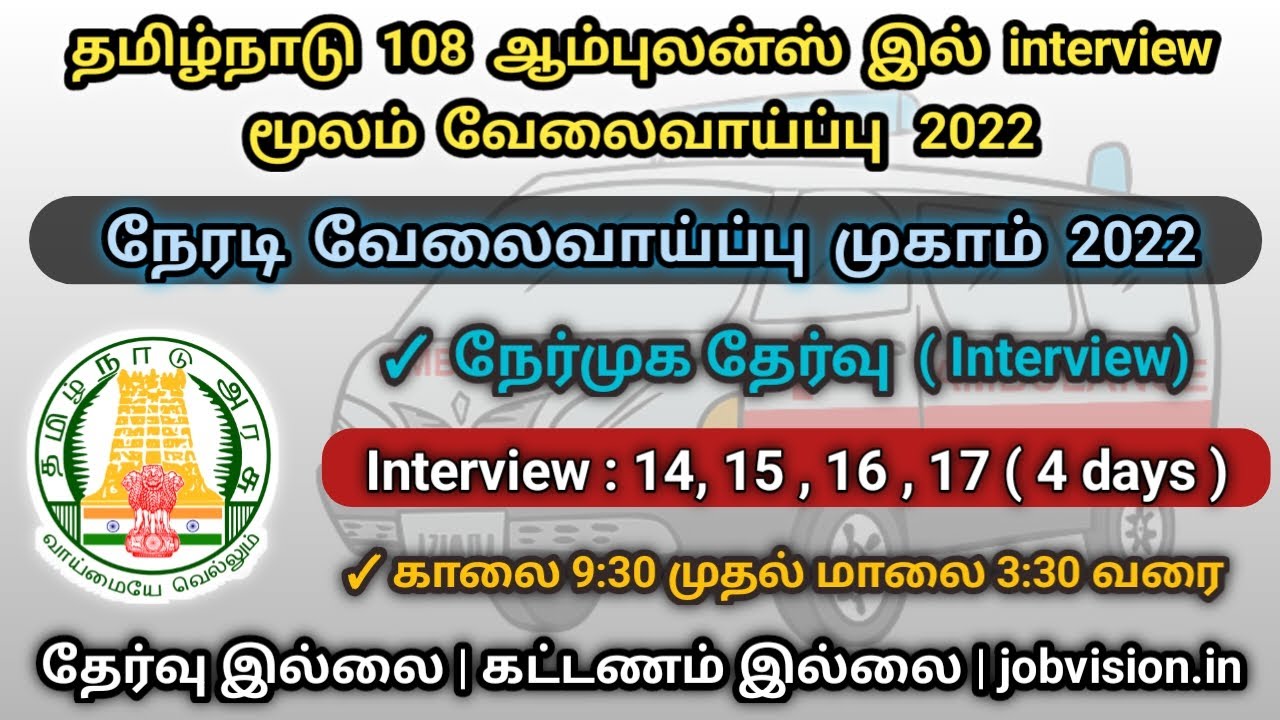 Tamil Nadu Government 108 Ambulance | Tamil Nadu Government 108 Ambulance Service has announced Various Vacancies for Driver, Medical Assistant Posts in , Tamil Nadu Nagapattinam, Mayiladuthurai, Thanjavur | Walk-In Interview Date : 14.03.2022 to 18.03.2022 | www.jobvision.in