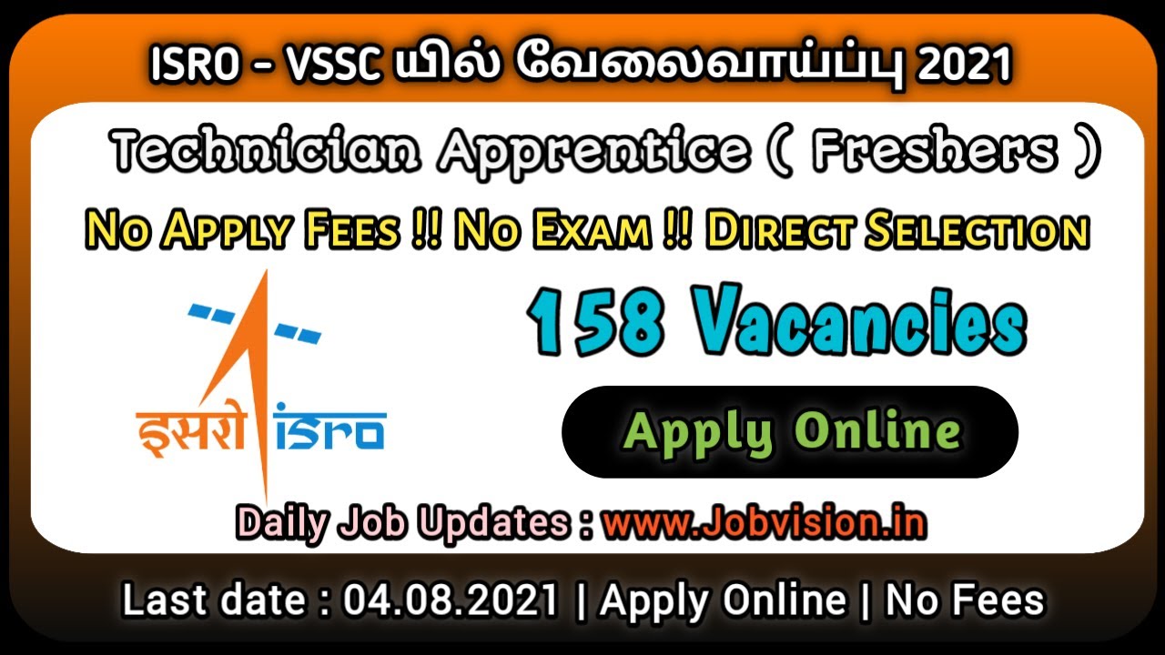 Vikram Sarabhai Space Centre has just released a new Job vacancies announcement for Technician Apprentice posts. This notification was announced on 26.07.2021. Diploma candidates can apply for 158 vacancies in Kerala, Tamil Nadu, Karnataka, Andhra Pradesh, Telangana, Puducherry . Applications are invited from eligible applicants. Therefore, those who are eligible and interested should apply online by 04.08.2021 Candidate who seeks for Vikram Sarabhai Space Centre can use this chance. Applicants must also have finished the educational qualification and age qualification mentioned in the Official notice. Those candidates who are interested in the following vacancy must Download and read the Official notification before applying to know the education qualification, salary, age limit, application fee, application process, last date to apply and more