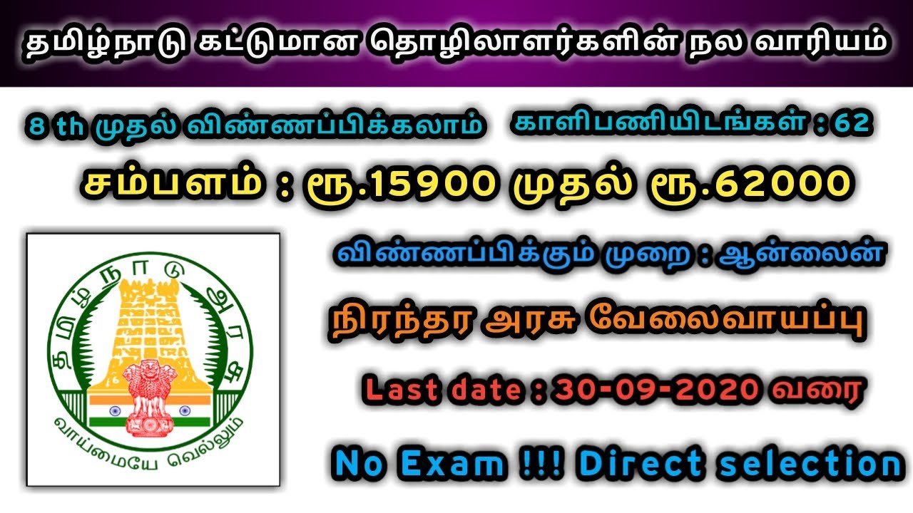 Tamilnadu Labour Department - தமிழ்நாடு கட்டுமான தொழிலாளர்கள் நலவாரியம் வேலைவாய்ப்பு 2020 | TN Govt